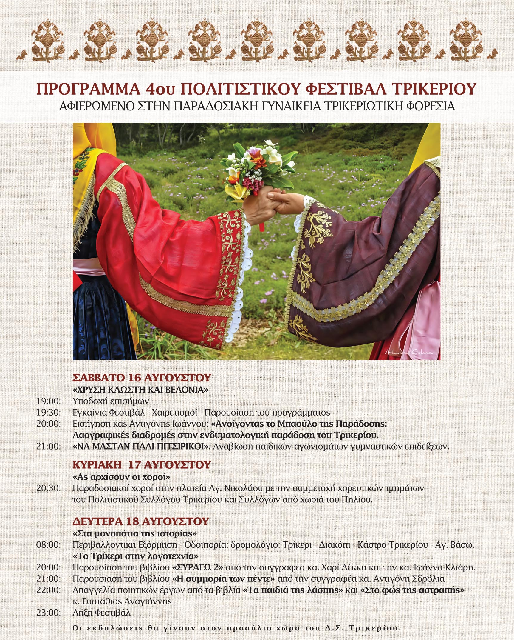 Το φεστιβάλ με τίτλο «Χρυσή κλωστή και βελονιά» θα διεξαχθεί στο Τρίκερι από τις 16 έως τις 18 Αυγούστου και είναι αφιερωμένο στην γυναικεία παραδοσιακή Τρικεριώτικη φορεσιά, με βασικό διοργανωτή τον Δήμο Νοτίου Πηλίου – το Φροντιστήριο Βιωσιμότητας του Δήμου Νοτίου Πηλίου και συνδιοργανωτές τον Πολιτιστικό-Εξωραϊστικό Σύλλογο Τρικερίου και τον Περιβαλλοντικό – Πολιτιστικό Σύλλογο Μύλου-Γεροπλίνας, “ΑΙΑΝΤΕΙΟ”.