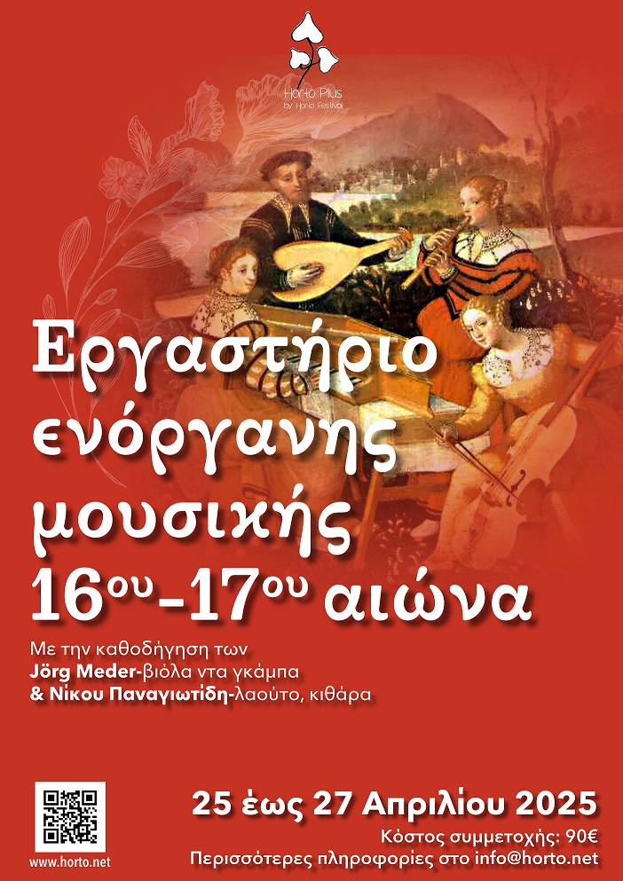 Εργαστήριο ενόργανης μουσικής 16ου-17ου αιώνα θα πραγματοποιηθεί από τις 25 έως τις 27 Απριλίου στο Ίδρυμα «Αγγελίνης Χατζηνίκου» στο Χόρτο, το οποίο απευθύνεται σε ερασιτέχνες ή επαγγελματίες όλων των οργάνων που θα ήθελαν να εξοικειωθούν με τη μουσική και τα παραδοσιακά όργανα της Αναγεννησιακής και Μπαρόκ περιόδου.Το εργαστήριο θα διεξαχθεί με την καθοδήγηση των Jorg Meder και Νίκου Παναγιωτίδη.