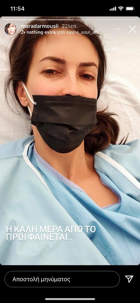 Στο νοσοκομείο μεταφέρθηκε εσπευσμένα η Μάρα Δαρμουσλή. Πιο συγκεκριμένα, η ηθοποιός ανέβασε σε story δύο φωτογραφίες της, οι οποίες την έδειχναν να είναι ξαπλωμένη στο κρεβάτι του νοσοκομείου φορώντας ιατρική ρόμπα και μάσκα προστασίας.