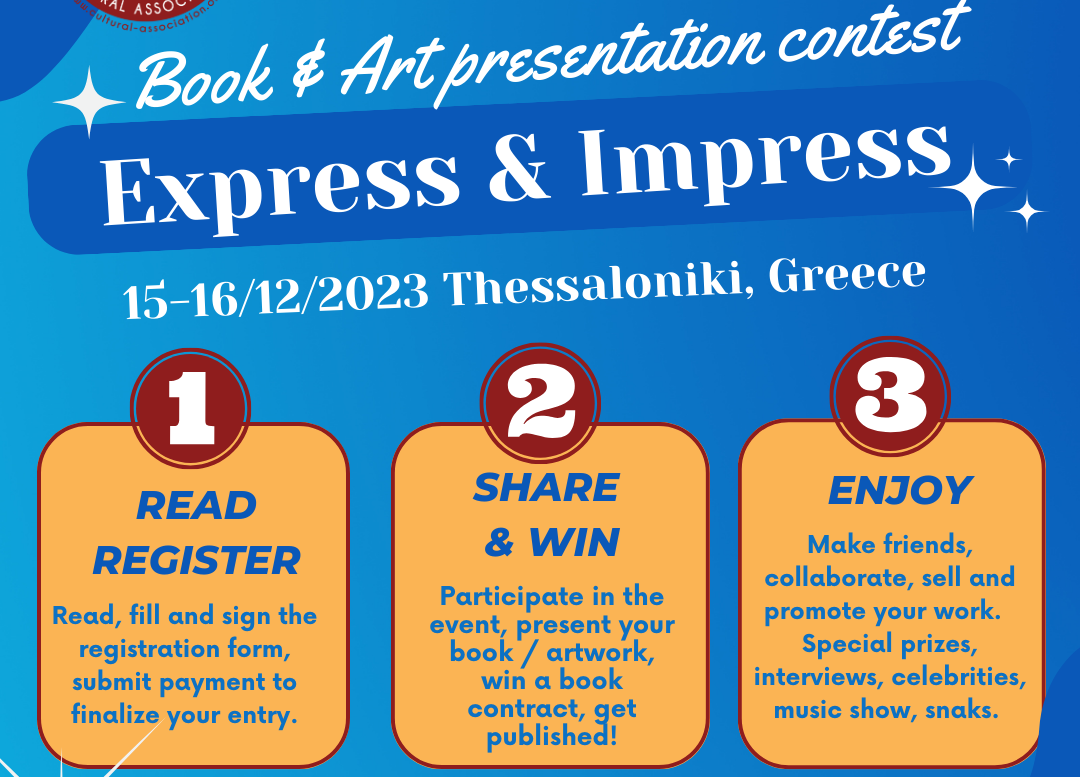 “Express & Impress” book & art presentation contest στις 15 και 16 Δεκεμβρίου 2023 στη Θεσσαλονίκη. Βιβλίο, Ζωγραφική, Πίνακας, Τραγούδι , Χορός, Μουσική, Φωνή, Κατασκευή, Εργόχειρο κα. Συμμετέχω με το δικό μου έργο τέχνης στον διαγωνισμό «Express & Impress», παρουσιάζω τη δουλειά μου μέσα σε 5 λεπτά με τρόπο πρωτότυπο, ευφάνταστο, δημιουργικό, διαδραστικό, ανθρώπινο, όπως θέλω και επιθυμώ! Κερδίζω την έκδοση δικού μου καλλιτεχνικού πονήματος.