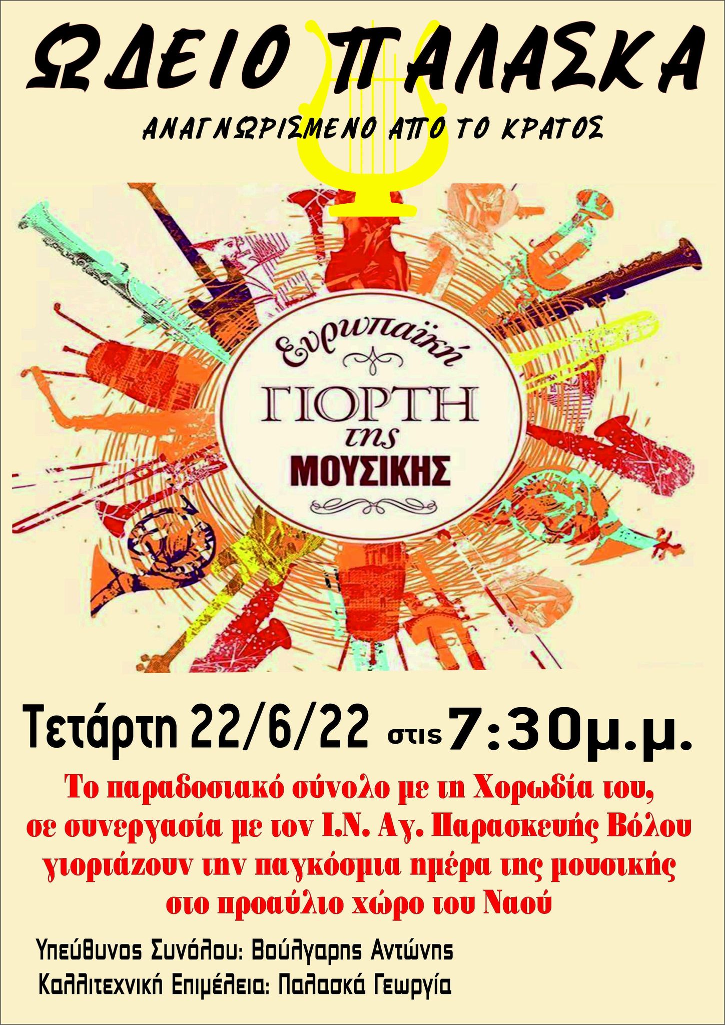 Το παραδοσιακό σύνολο με τη χορωδία του σε συνεργασία με τον Ιερό Ναό Αγίας Παρασκευής Βόλου γιορτάζουν σήμερα την Παγκόσμια Ημέρα της Μουσικής στον προαύλιο χώρο του Ναού, μια Ευρωπαϊκή Γιορτή Μουσικής στις 7.30 το απόγευμα. Υπεύθυνος του συνόλου είναι ο Αντώνης Βούλγαρης, ενώ την καλλιτεχνική επιμέλεια έχει η Γεωργία Παλάσκα.