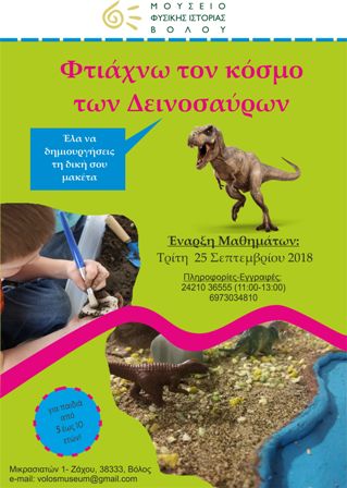 Από την Τρίτη 25 Σεπτεμβρίου 2018 ξεκινάει το εκπαιδευτικό πρόγραμμα «Φτιάχνω των κόσμο των δεινοσαύρων» στο Μουσείο Φυσικής Ιστορίας Βόλου, το οποίο απευθύνεται σε παιδιά ηλικίας από 5 έως 10 ετών.