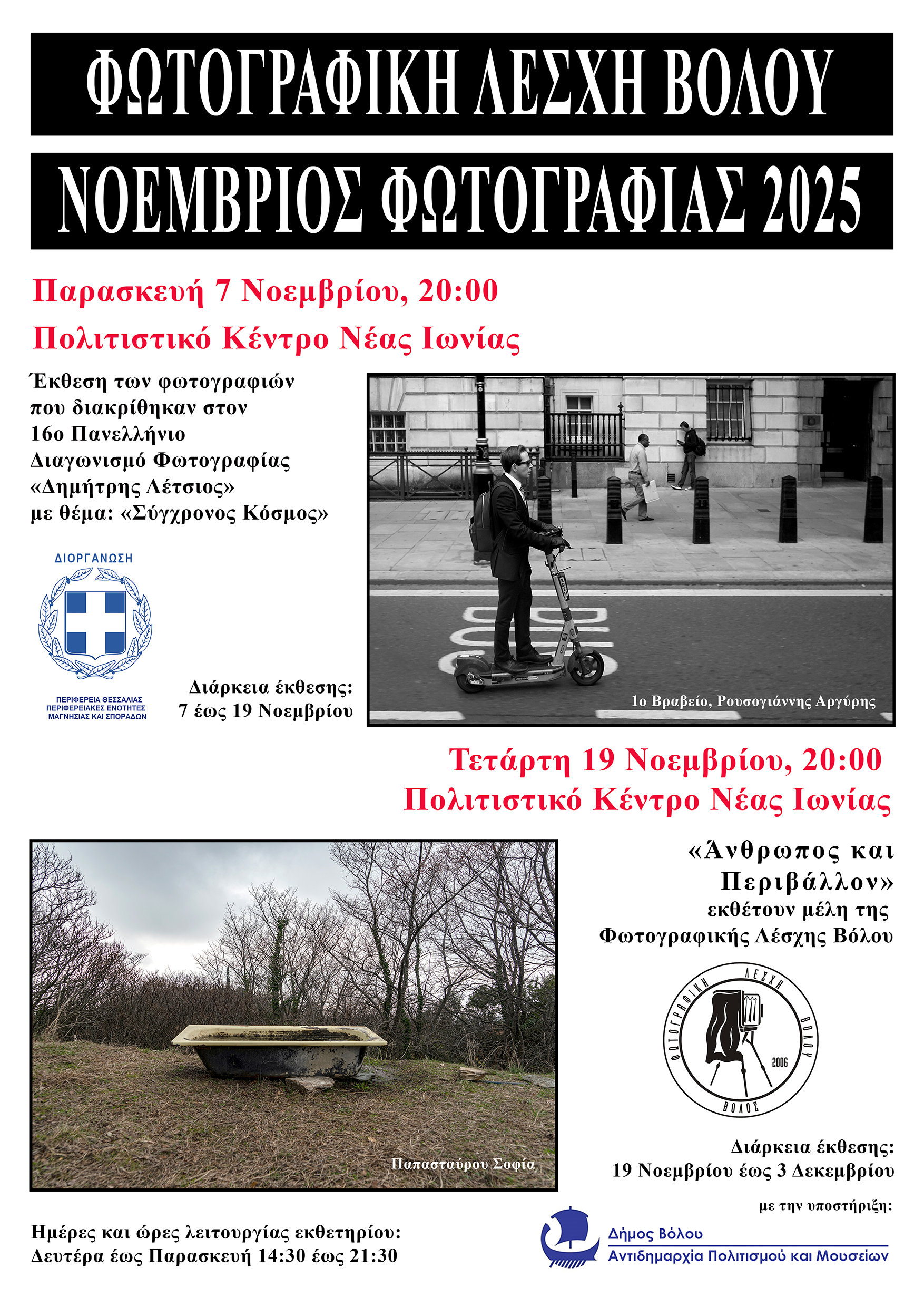Τετάρτη 19 Νοεμβρίου, στις 20:00, στο Πολιτιστικό Κέντρο Νέας Ιωνίας, εγκαινιάζεται η ομαδική έκθεση μελών της Φωτογραφικής Λέσχης Βόλου με τίτλο: «Άνθρωπος και περιβάλλον» στην οποία συμμετέχουν 20 εκθέτες με 107 έργα τους: Κωνσταντίνος Αδάμος, Άντα Αλεξίου, Αλεξάνδρα Βασιλείου, Βαγγέλης Βογιαντζής, Τζένη Γεωργακάκου, Ελένη Δαπόντα, Σπυρίδων Δαπόντας, Οδυσσέας Ζαγορίτης, Λεωνίδας Ζωγράφος, Αλεξάνδρα Θεολόγου, Μυρτώ Καϊοπούλου, Βασιλική Καραφύλλη, Γιάννης Κοϊνάκης, Εριφύλη Κρανά, Βασιλική Προβελεγγίου – Λεπίδα, Αντώνης Παναγιώτου, Σοφία Παπασταύρου, Αργύρης Ρουσογιάννης, Νίκη Σβολιαντοπούλου, Εύη Υφαντή.