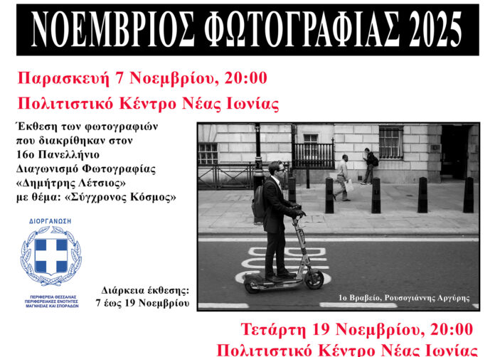 Παρασκευή 7 Νοεμβρίου, στις 20:00, στο Πολιτιστικό Κέντρο Νέας Ιωνίας, εγκαινιάζεται η έκθεση των φωτογραφιών που διακρίθηκαν στον 16ο Πανελλήνιο Διαγωνισμό Φωτογραφίας «Δημήτρης Λέτσιος» με θέμα: «Σύγχρονος Κόσμος».