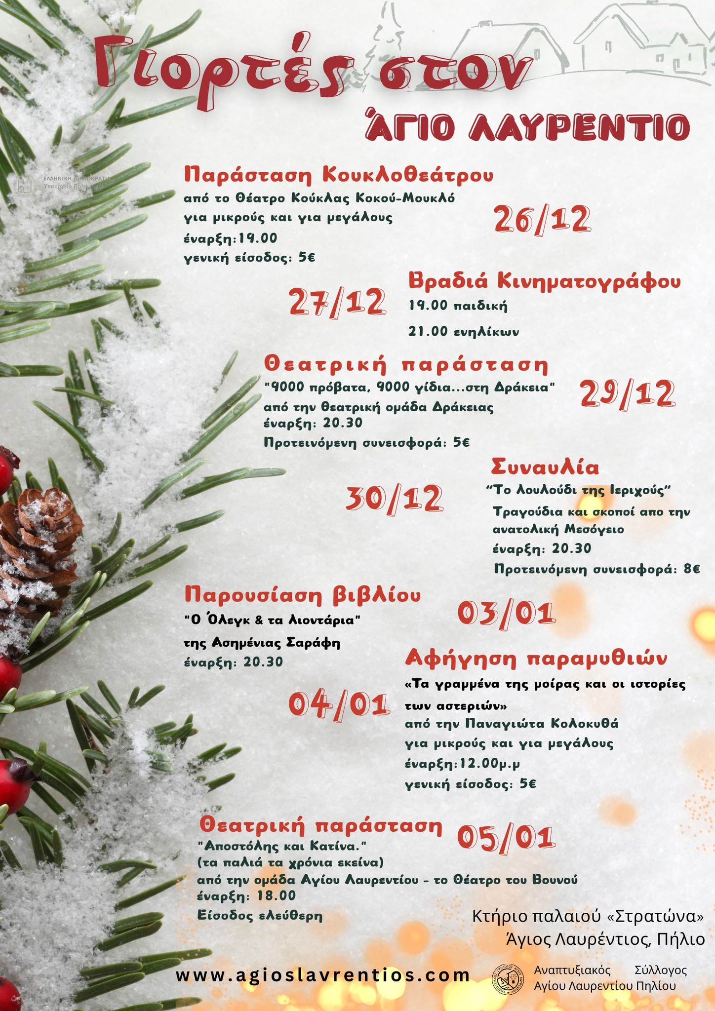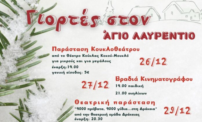 Ο Αναπτυξιακός Σύλλογος Αγίου Λαυρεντίου οργανώνει και φιλοξενεί μια σειρά από εκδηλώσεις για τις γιορτές, που θα γεμίζουν το χωριό με τραγούδια, μουσικές, θέατρο, ιστορίες και συναντήσεις.