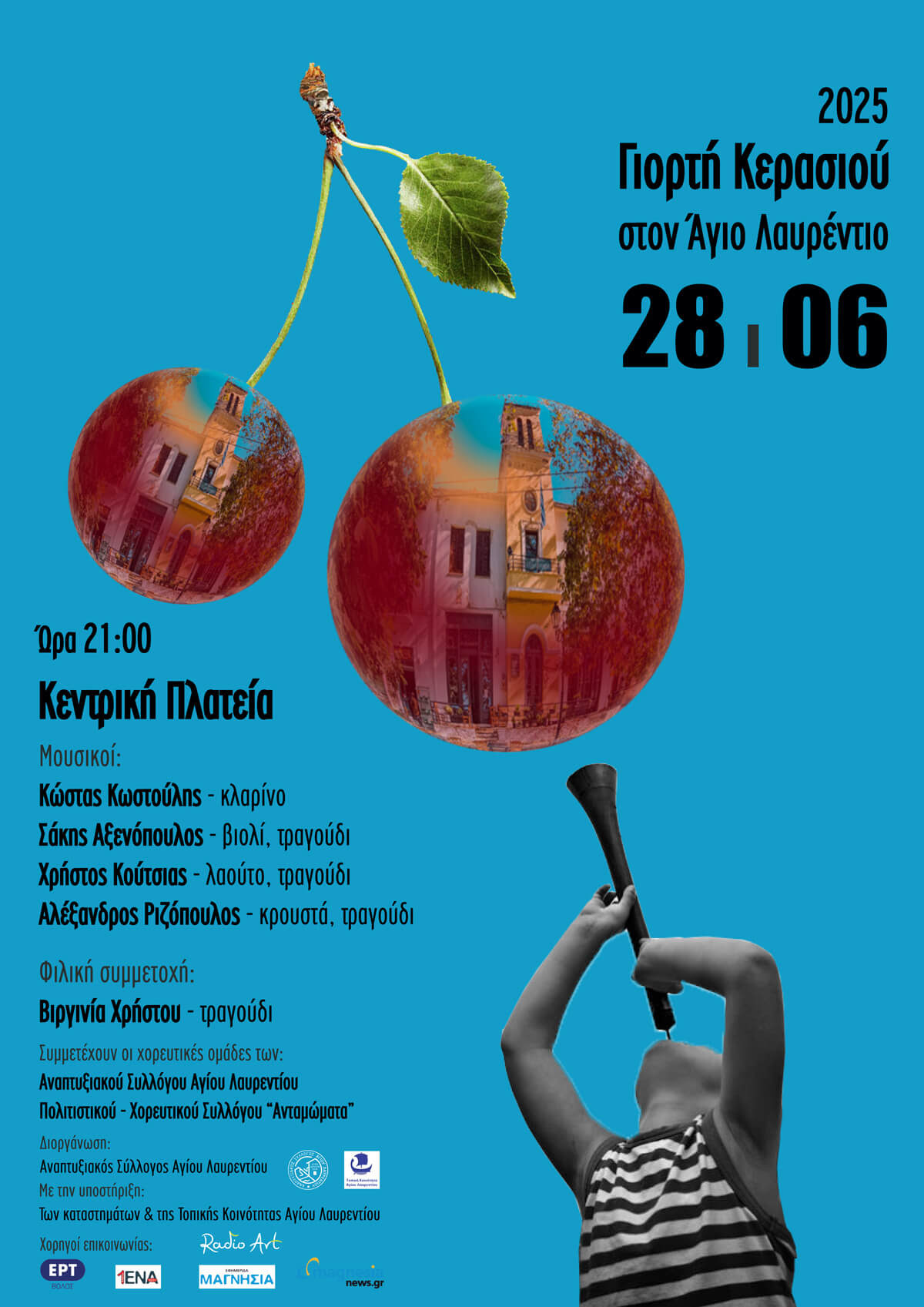 Ο Αναπτυξιακός Σύλλογος Αγίου Λαυρεντίου διοργανώνει για ακόμη μία χρονιά, το Σάββατο 28 Ιουνίου στις 21:00 τη Γιορτή Κερασιού.