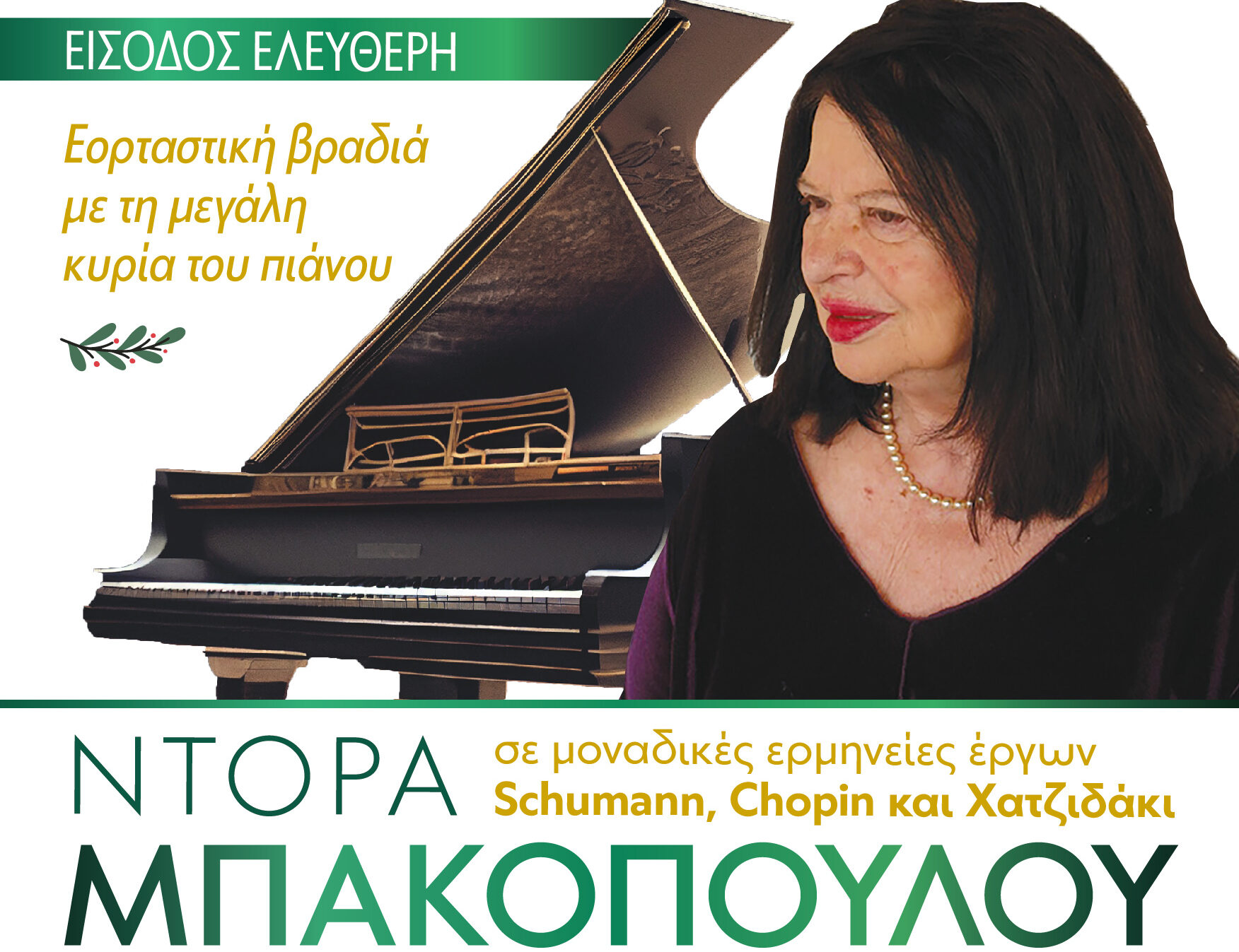 Η Ντόρα Μπακοπούλου, Ελληνίδα πιανίστα και παιδαγωγός, αναγνωρίζεται ως μία από τις κορυφαίες εκπροσώπους της πιανιστικής τέχνης όχι μόνο στην Ελλάδα αλλά και διεθνώς, με εμφανίσεις στους πιο διάσημους συναυλιακούς χώρους ανά τον κόσμο. Η είσοδος είναι ελεύθερη με απαραίτητη κράτηση θέσεων στα τηλ. 6972085291 Κ. Πορφυρογένη και 6973793901 Απ. Αποστολάκης, όχι sms όχι messenger. Στα ίδια τηλέφωνα για τυχόν ακυρώσεις που οι διοργανωτές παρακαλούν να γίνονται όσο το δυνατόν έγκαιρα.