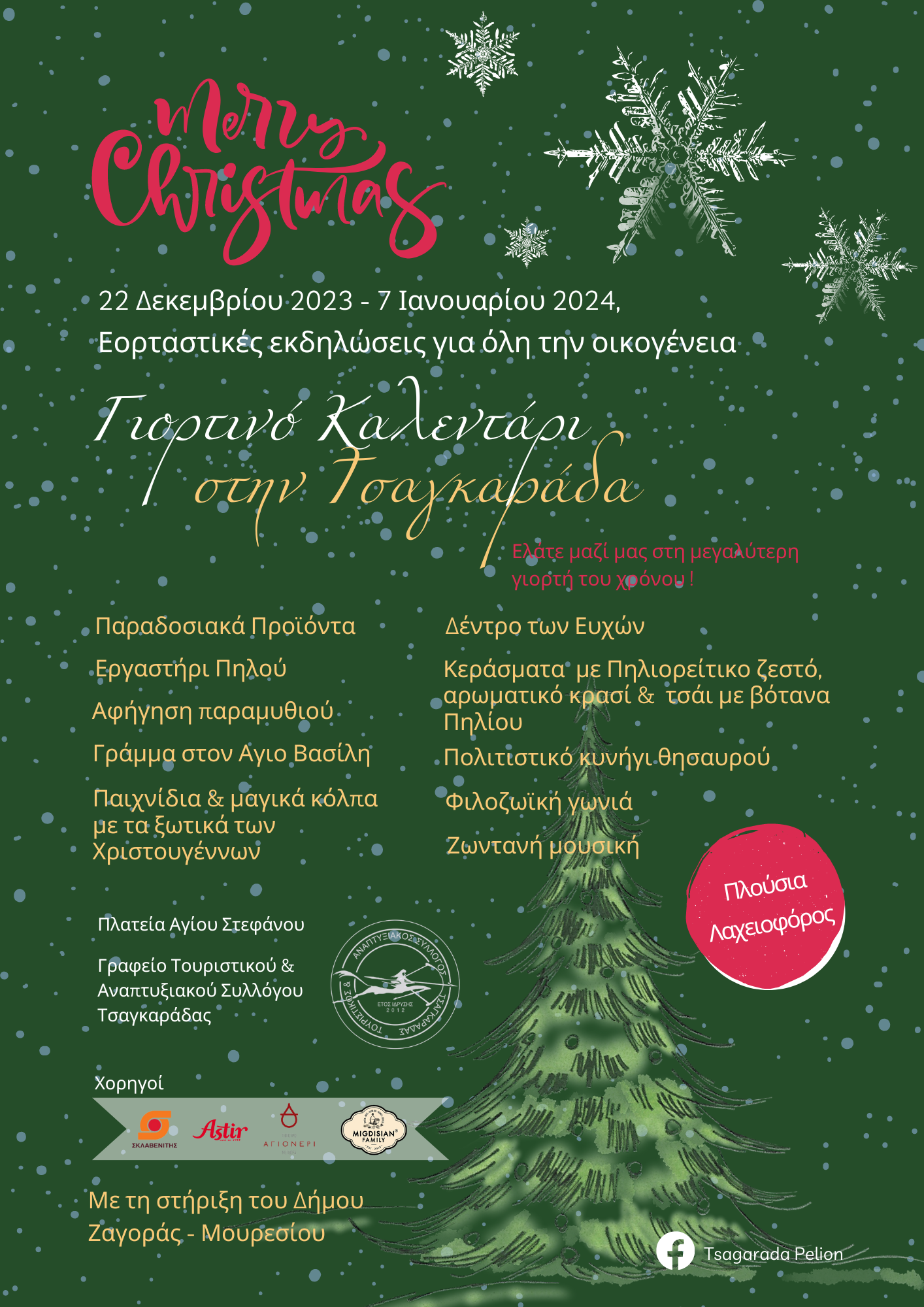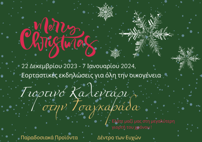Η Τσαγκαράδα προσκαλεί όλους να γιορτάσουν την περίοδο των Χριστουγέννων και για όλη την διάρκεια των εορταστικών ημερών ο Τουριστικός & Αναπτυξιακός Σύλλογος Επαγγελματιών Τσαγκαράδας διοργανώνει εκδηλώσεις για παιδιά και μεγάλους.