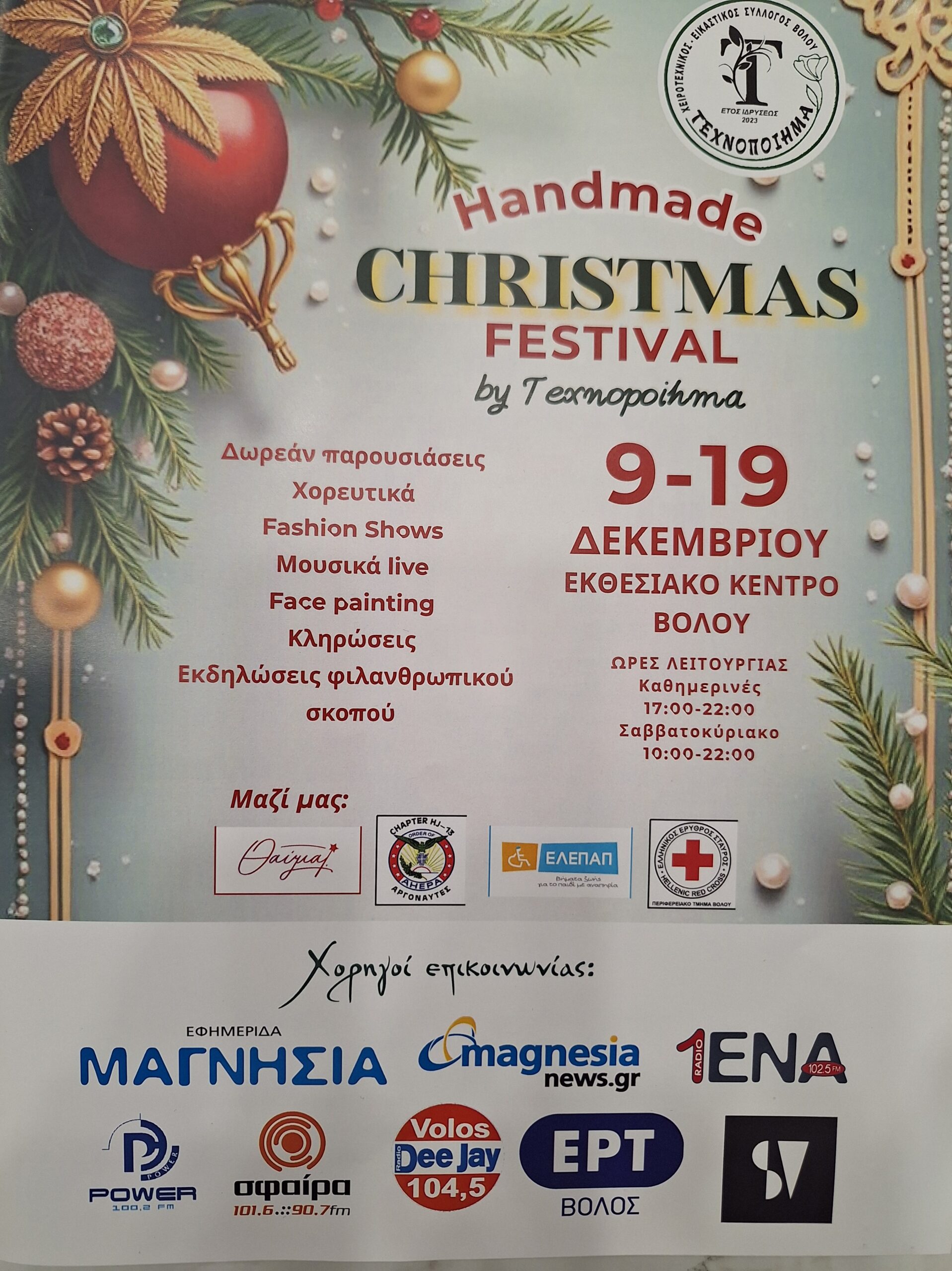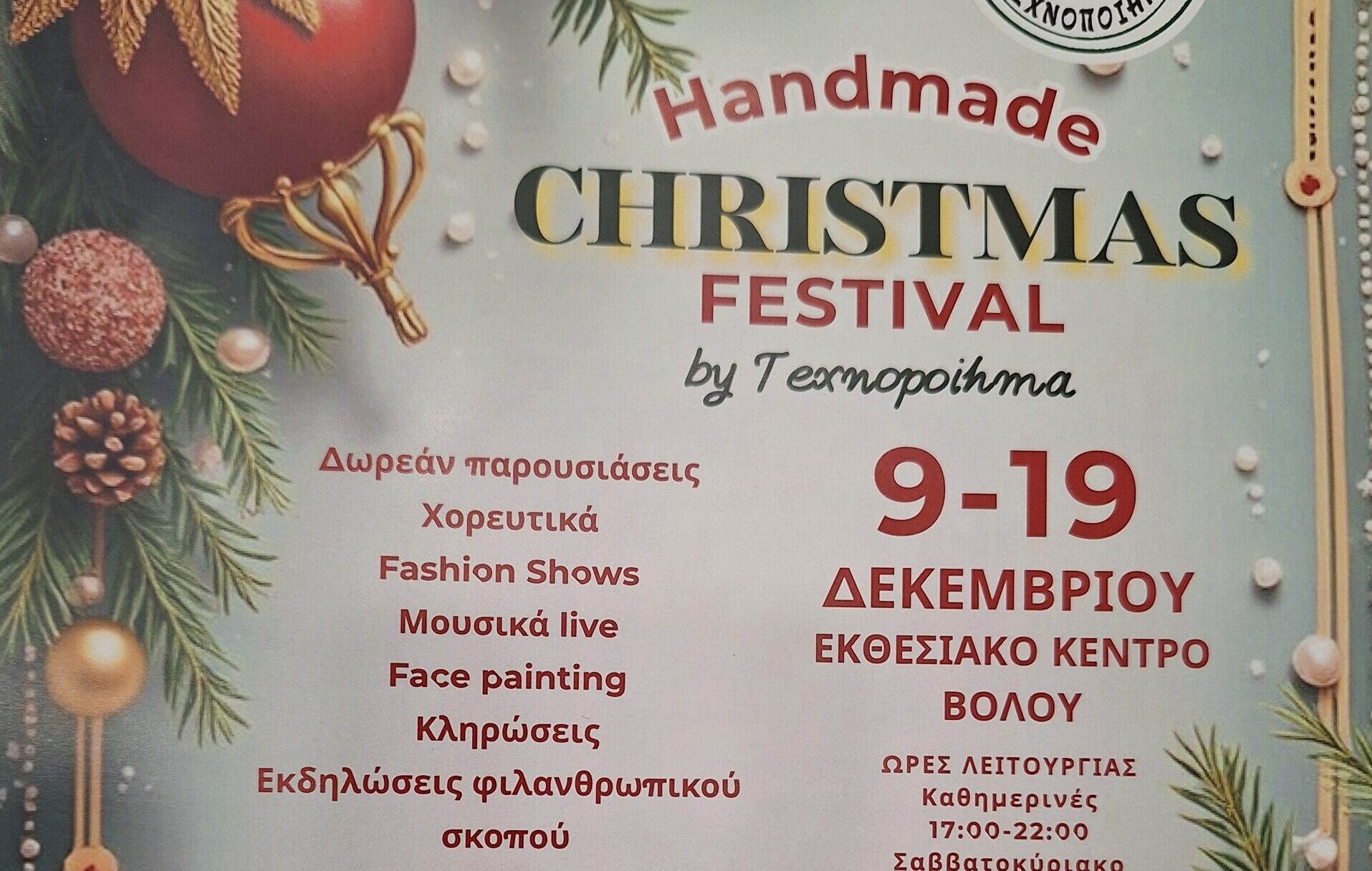 Τις πύλες του άνοιξε χθες το χριστουγεννιάτικο φεστιβάλ που πραγματοποιεί το Τεχνοποίημα στο Εκθεσιακό Κέντρο Βόλου. Το Hand Made Christmas Festival φιλοξενεί για ως τις 19 Δεκεμβρίου πλήθος καλλιτεχνών, χειροποίητων δημιουργιών, δρωμένων και εργαστηρίων από τοπικούς και πανελλήνιας εμβέλειας δημιουργούς.