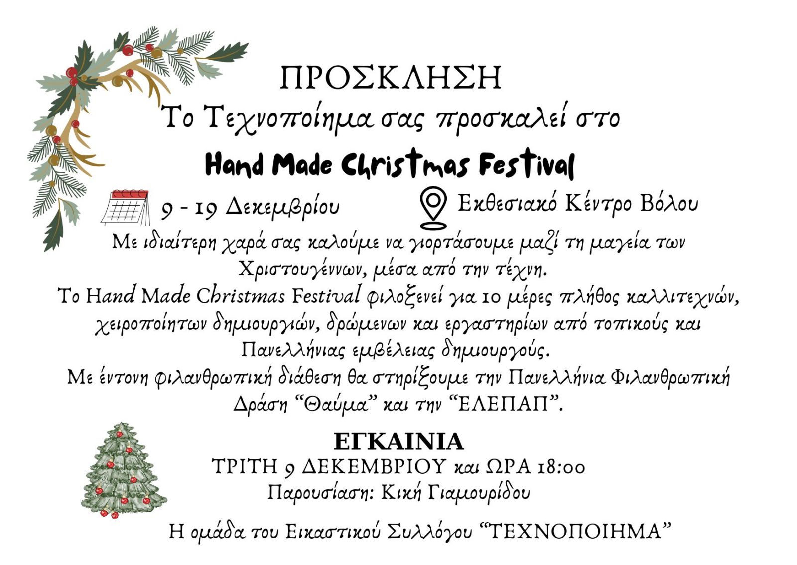 Το Τεχνοποίημα πραγματοποιεί το χειροποίητο χριστουγεννιάτικο φεστιβάλ του από τις 9 ως τις 19 Δεκεμβρίου στο Εκθεσιακό Κέντρο Βόλου. Το Hand Made Christmas Festival φιλοξενεί για δέκα ημέρες πλήθος καλλιτεχνών, χειροποίητων δημιουργιών, δρωμένων και εργαστηρίων από τοπικούς και πανελλήνιας εμβέλειας δημιουργούς.