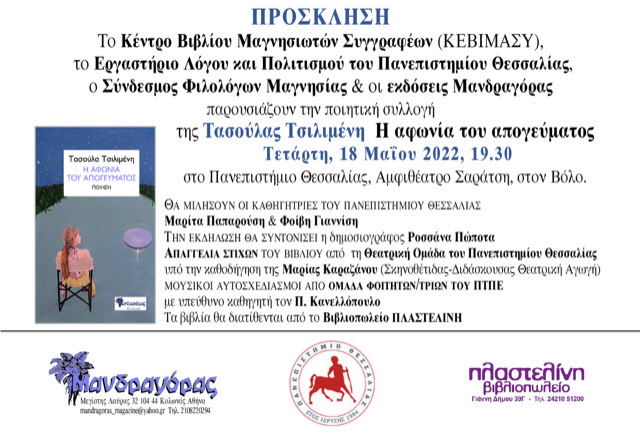 Το Κέντρο Βιβλίου Μαγνησιωτών Συγγραφέων (ΚΕΒΙΜΑΣΥ), Το Εργαστήριο Λόγου και Πολιτισμού του Πανεπιστημίου Θεσσαλίας, ο Σύνδεσμος Φιλολόγων Μαγνησίας και οι εκδόσεις Μανδραγόρας μας προσκαλούν στην παρουσίαση της ποιητική συλλογή της Τασούλας Τσιλιμένη με τίτλο «Η αφωνία του απογεύματος», την Τετάρτη 18 Μαΐου, ώρα 19.30, στο Πανεπιστήμιο Θεσσαλίας, στο Αμφιθέατρο Σαράτση στον Βόλο.