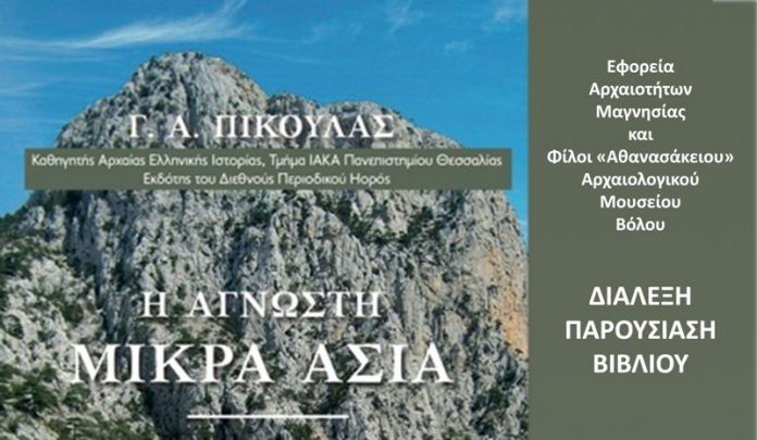 Ομιλητής θα είναι ο συγγραφέας κ. Γιάννης Αντ. Πίκουλας, Καθηγητής Αρχαίας Ελληνικής Ιστορίας, Τμήμα ΙΑΚΑ, στο Πανεπιστήμιο Θεσσαλίας, με θέμα: Η Άγνωστη Μικρά Ασία. Ιστορικό και αρχαιολογικό οδοιπορικό. Η εκδήλωση θα πραγματοποιηθεί τη Δευτέρα 7 Νοεμβρίου 2016 και ώρα 18.30-20.30 στην αίθουσα εκδηλώσεων του Αθανασάκειου Αρχαιολογικού Μουσείου Βόλου (Αθανασάκη 1).