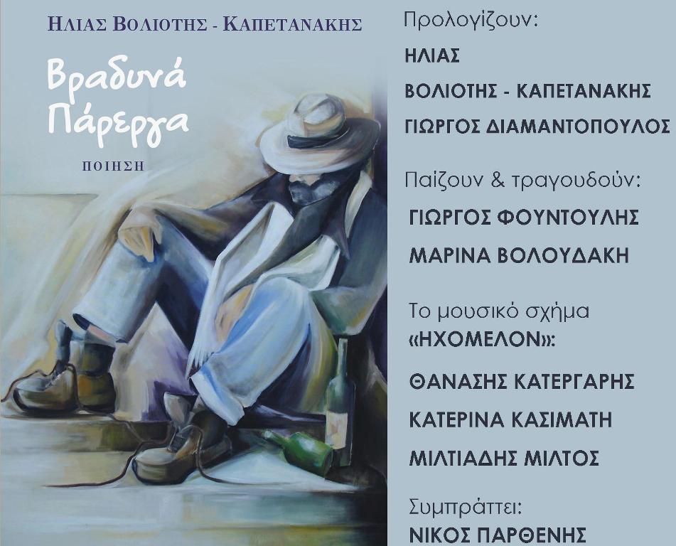 Όμορφη ποιητική και μελωδική βραδιά διοργανώνεται, με ελεύθερη είσοδο, στον Πολυχώρο Τέχνης του Ωδείου Φουντούλη, Αντωνοπούλου 17, τηλέφωνο 6909 – 127982, την Παρασκευή 7 Απριλίου στις 9.30 μ. μ., με τίτλο «Η Άνοιξη του Πάθους και της Ανάστασης». Την επιμελείται ο δημοσιογράφος Ηλίας Βολιότης – Καπετανάκης με αφορμή μόνο την ποιητική συλλογή «Βραδυνά Πάρεργα» (Εκδόσεις Μετρονόμος).
