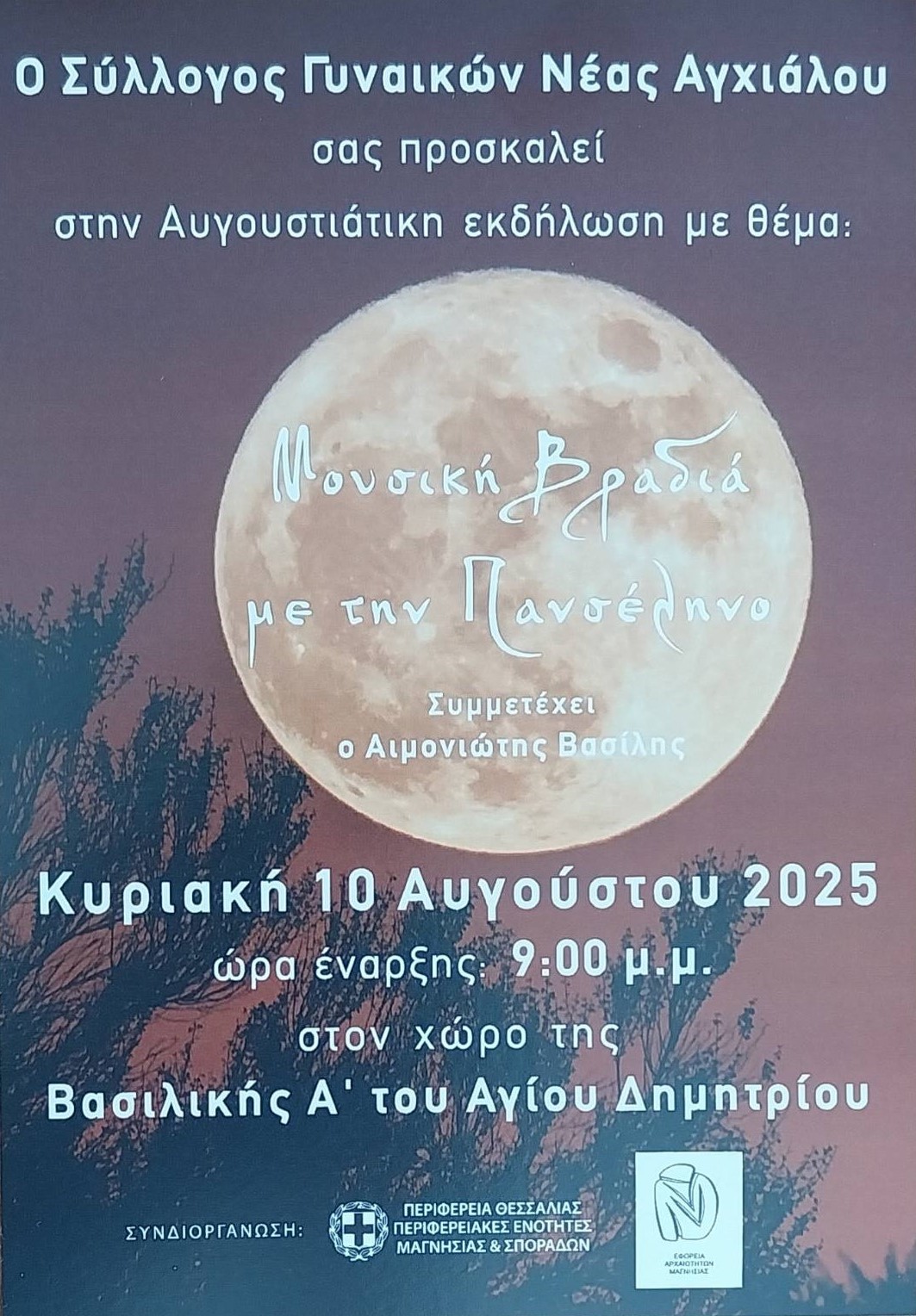Η Εφορεία Αρχαιοτήτων Μαγνησίας συμμετέχει και φέτος στους εορτασμούς, με τη «Μουσική βραδιά με την Πανσέληνο», στον Αρχαιολογικό Χώρο της Βασιλικής Α΄ Αγίου Δημητρίου Φθιωτίδων Θηβών, στη Νέα Αγχίαλο, σε συνεργασία με την Περιφέρεια Θεσσαλίας και τον Σύλλογο Γυναικών Νέας Αγχιάλου, την Κυριακή 10 Αυγούστου και ώρα 21:00.