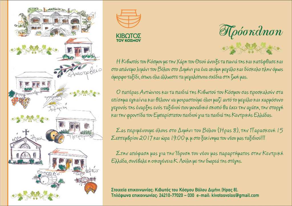 Τα εγκαίνια θα πραγματοποιηθούν την Παρασκευή 15 Σεπτεμβρίου 2017 και ώρα 7.00 μ.μ.. Μετά την τέλεση των εγκαινίων θα ακολουθήσει εκδήλωση στην οποία θα συμμετέχουν τα παιδιά μας, η Μπάντα του Πολεμικού Ναυτικού και το Μουσικό Σχολείο του Βόλου. Θα χαρούμε να μοιραστούμε μαζί σας το χαρμόσυνο μήνυμα της έναρξης του καινούριου μας ταξιδιού…».