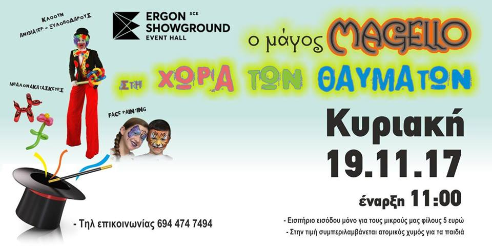 Ο Μάγος Magello έχει κατακτήσει τις καρδιές των μικρών μας φίλων! Επιστρέφει στο Ergon Showground αύριο Κυριακή 19 Νοεμβρίου στις 11 το πρωί, με μια μαγική, κωμική παράσταση και έρχεται να μας διασκεδάσει με απίθανα ταχυδακτυλουργικά κόλπα! Στην «Χώρα των Θαυμάτων» ο μάγος Magello δεν είναι μόνος!
