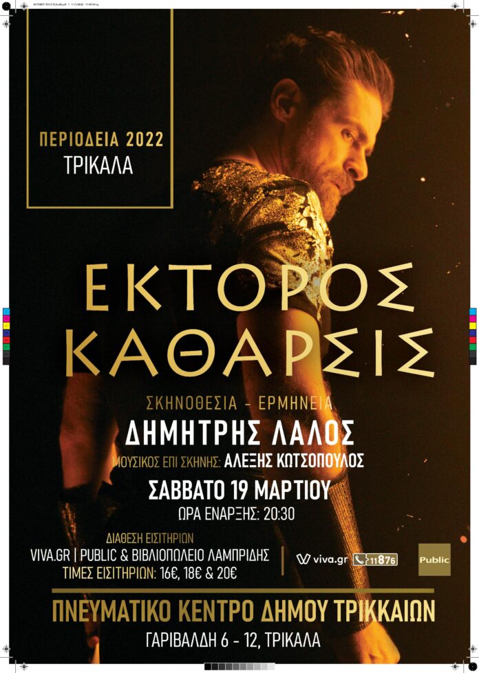 Η «Έκτορος Κάθαρσις» είναι η Ιλιάδα από την πλευρά του Έκτορα, θεατρικό έργο το οποίο επισκέπτεται την πόλη του Βόλου την Κυριακή 20 Μαρτίου, στο Δημοτικό Θέατρο Νέα Ιωνίας, στις 20.30. Όπως αναφέρεται στη σχετική ανακοίνωση ο Δημήτρης Λάλος, με όχημα το ομηρικό έπος, επιχειρεί αφενός την ανάδειξη του μύθου από την σκοπιά του Έκτορα – μία σπάνια προσέγγιση του κειμένου- αφετέρου την «αποκατάσταση» του ήρωα στη θέση που του αρμόζει, αναδεικνύοντας ακόμα περισσότερο τα υψηλά ιδανικά που διέπουν τα Ομηρικά Έπη.