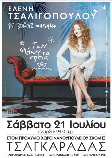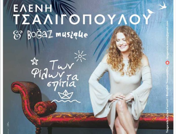 «Των φίλων τα σπίτια» είναι ο τίτλος της παράστασης που θα δώσει η Ελένη Τσαλιγοπούλου με τους Bogaz Musique, την 6μελή μπάντα της, στις 21 Ιουλίου 2018 στις 9.00 μ.μ. στον προαύλιο χώρο της Νανοπουλείου σχολής στην Τσαγκαράδα, στο Πήλιο και την οποία διοργανώνει ο τοπικός Τουριστικός & Αναπτυξιακός Σύλλογος.
