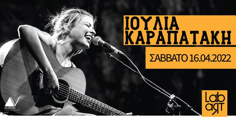 Απόψε Σάββατο 16 Απριλίου η μαγική φωνή της Ιουλίας Καραπατάκη έρχεται στον Βόλο για μια παρθενική εμφάνιση στο Lab Art. Όπως αναφέρεται σε σχετική ανακοίνωση η Ιουλία Καραπατάκη τραγουδάει όπως γελάει. Με την καρδιά της! Για αυτήν το τραγούδι είναι ο τρόπος που επικοινωνεί σκέψεις και συναισθήματα. Για πρώτη φορά στο χώρο του Lab Art, μετά κι από την εμφάνισή της που αναβλήθηκε τον περασμένο χειμώνα, θα έχουμε την τιμή να τη δούμε από κοντά.