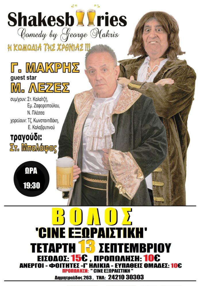 Η θεατρική κωμωδία Shakesbeeries που χαρίζει αβίαστο γέλιο, περιοδεύει στην Ελλάδα και στην πόλη του Βόλου την Τετάρτη 13 Σεπτεμβρίου στο Cine Εξωραϊστική (Δημητριάδος 263).