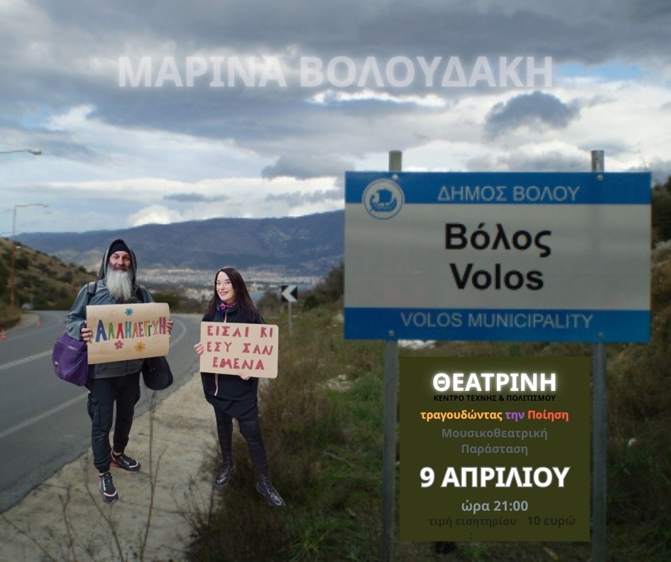 Η Μαρίνα Βολουδάκη ερμηνεύει ποιήματα σύγχρονων Ελλήνων ποιητών, τραγουδώντας και απαγγέλλοντας με πάθος. Η ερμηνεία της Μ. Βολουδάκη βαθιά και ανασκαπτική, μεταμορφώνει την ποίηση σε βίωμα, δίνοντας διάσταση φωνής ,ψυχής και ύλης.. Ο λόγος γίνεται ο δρόμος προς την εσωτερική μας αναζήτηση…Ο Σπυρίδωνας δημιουργεί πρωτότυπα ηχοτοπία με τις κιθάρες του, προσφέροντας μοναδική μουσική διάσταση στα ποιήματα. Οι μελωδίες του φωτίζουν τις λέξεις, τις αποδομούν ,τις ξαναχτίζουν σε μία νέα μουσική πραγματικότητα. Μαζί μετατρέπουν την ποίηση σε τραγούδι, γεφυρώνοντας τον λόγο με τη μελωδία. Μια ζωντανή εμπειρία γεμάτη συναίσθημα και δημιουργικότητα που θα σας μείνει αξέχαστη. Οι ποιητές :Βέρα Βασιλείου – Πέτσα, Sunny Μπαλτζή, Ηλίας Παπακωνσταντίνου, Γιάννης Καλπούζος, Θανάσης Σάλτας, Χρίστος Αλιπράντης, Αδάμος Μουζουρής, Εσσάμ Θεόδωρος Αλαντάση, Νίκος Παπαδόπουλος και Δημήτρης Αβούρης. Τιμή εισιτηρίου 10 ευρώ.