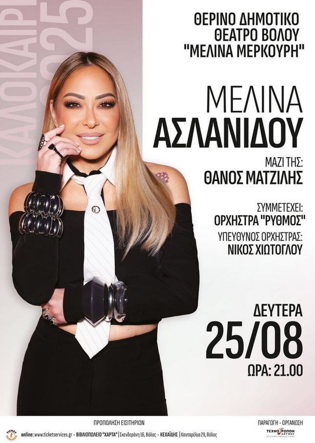 Έπειτα από αρκετά χρόνια απουσίας απ΄τον Βόλο, η Μελίνα Ασλανίδου επιστρέφει στην πόλη μας, για μια μοναδική συναυλία που φιλοδοξεί να αποτελέσει σημείο αναφοράς στο φετινό πολιτιστικό καλοκαίρι της πόλης. Στις 25 Αυγούστου το Θερινό Δημοτικό Θέατρο Βόλου θα γεμίσει με αγαπημένες μελωδίες, λαϊκές και έντεχνες δημιουργίες, αλλά και έντονα παραδοσιακά στοιχεία, σε μια βραδιά που θα συνδυάσει μνήμες, συγκίνηση και γιορτινή διάθεση. Η σπουδαία ερμηνεύτρια, θα μοιραστεί τη σκηνή με τον συμπολίτη μας ερμηνευτή, Θάνο Ματζίλη και την ορχήστρα «Ρυθμός» υπό την διεύθυνση του Νίκου Χιώτογλου, συνεχίζοντας μια περιοδεία που έχει ήδη αφήσει τις καλύτερες εντυπώσεις σε Ελλάδα και Κύπρο.