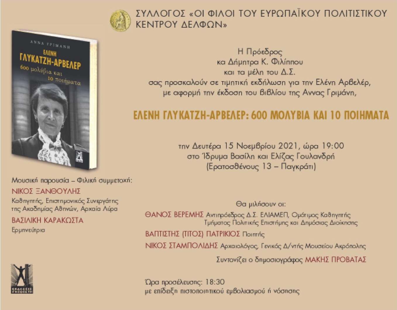 Ο Σύλλογος “Οι Φίλοι του Ευρωπαϊκού Πολιτιστικού Κέντρου Δελφών” πραγματοποιούν τιμητική εκδήλωση για την Ελένη Αρβελέρ, με αφορμή την έκδοση του βιβλίου της Άννας Γριμάνη με τίτλο “Ελένη Γλύκατζη Αρβελέρ: 600 μολύβια και 10 ποιήματα” τη Δευτέρα 15 Νοεμβρίου στις 19:00 στο Ίδρυμα Βασίλη και Ελίζας Γουλανδρή.