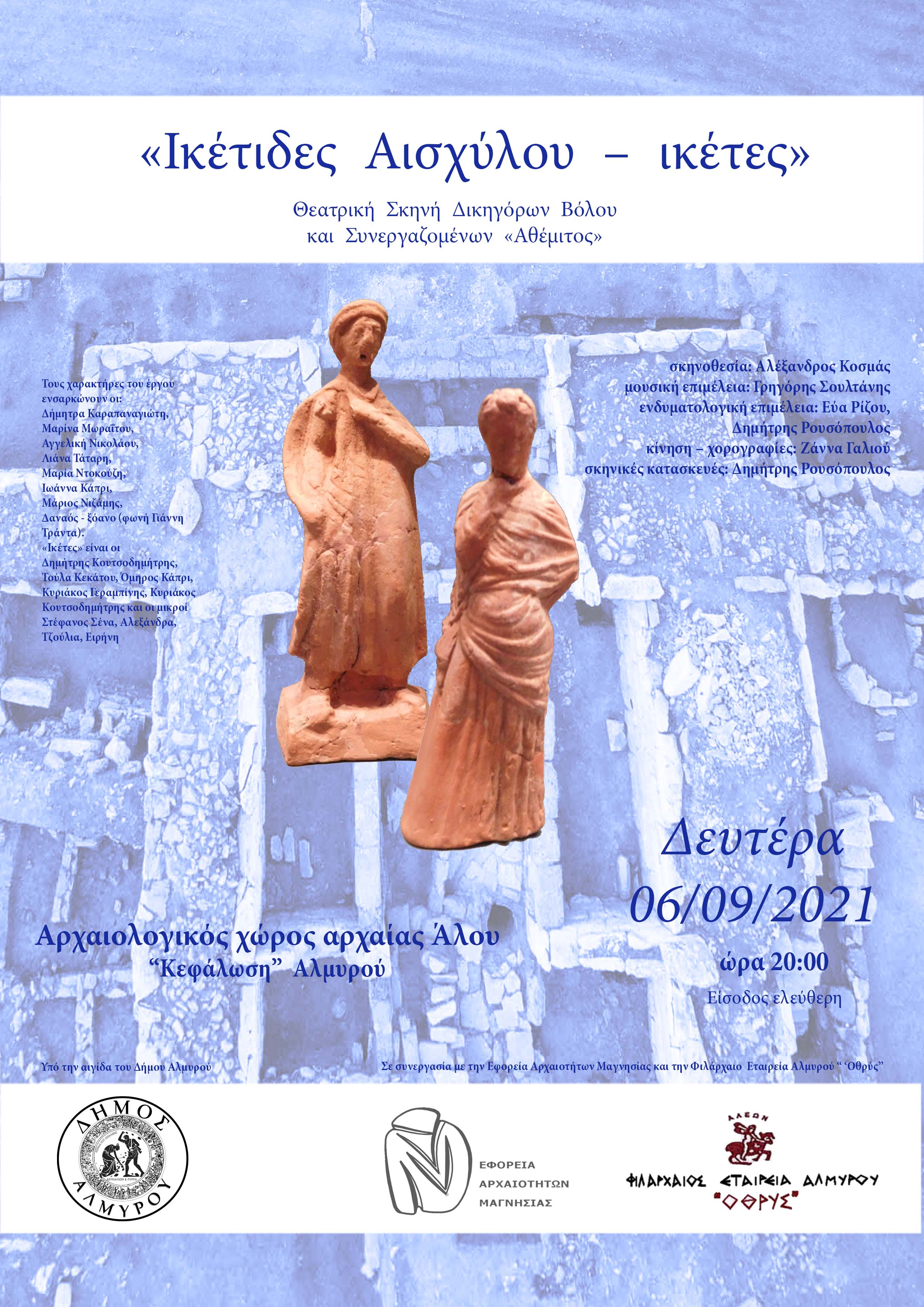 Η Θεατρική Σκηνή Δικηγόρων και Συνεργαζομένων «Αθέμιτος» παρουσιάζει την παράσταση «Ικέτιδες Αισχύλου – ικέτες» στον αρχαιολογικό χώρο της αρχαίας Άλου στον Αλμυρό, την Δευτέρα 6 Σεπτεμβρίου στις 8:00μμ. Η παράσταση, η οποία για πρώτη φορά παρουσιάστηκε με επιτυχία στις 23 Αυγούστου στο αρχαίο θέατρο της Δημητριάδος, ανεβαίνει υπό την αιγίδα του Δήμου Αλμυρού, σε συνεργασία με την Εφορεία Αρχαιοτήτων Μαγνησίας και την Φιλάρχαιο Εταιρεία Αλμυρού «’Οθρυς». Η ίδια παράσταση θα δοθεί λίγες μέρες μετά στο Θερινό Δημοτικό Θέατρο της Νέας Ιωνίας Βόλου.