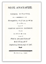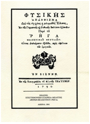 Κατά την τελευταία δεκαετία του 18ου αιώνα εμφανίζεται η πληθωρική, πολύπτυχη φυσιογνωμία του Ρήγα. Αρχικά το 1790 με τα δύο διαφωτιστικά του βιβλία, το «Σχολείον των ντελικάτων εραστών», που αποτελεί το πρώτο στο νέο είδος του διηγήματος στην ελληνική γλώσσα, και το «Φυσικής απάνθισμα», με το οποίο μεταφέρει, όπως έχουμε δείξει με τις εργασίες μας, την επιστημονική γνώση της γαλλικής Εγκυκλοπαίδειας των Ντιντερώ και Ντ’ Αλαμπέρ.