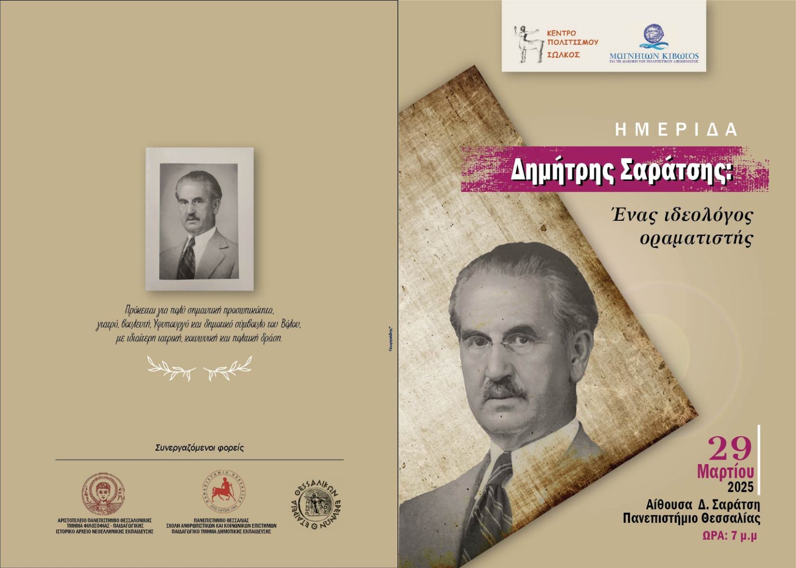 Ημερίδα για τον σπουδαίο γιατρό και πολιτικό Δημήτρη Σαράτση με την πολυδιάστατη συμβολή στην εκπαιδευτική και ευρύτερα πνευματική εξέλιξη του τόπου διοργανώνουν το Κέντρο Πολισμού Ιωλκός, σε συνεργασία με τον πολιτιστικό φορέα της Ιεράς Μητρόπολης Δημητριάδος «Μαγνήτων Κιβωτός» για τη διάσωση του πολιτιστικού αποθέματος, το Παιδαγωγικό Τμήμα Δημοτικής Εκπαίδευσης του Πανεπιστημίου Θεσσαλίας και το Τμήμα Φιλοσοφίας – Παιδαγωγικής, Ιστορικό Αρχείο Νεοελληνικής Εκπαίδευσης του ΑΠΘ και την Εταιρεία Θεσσαλικών Ερευνών.
