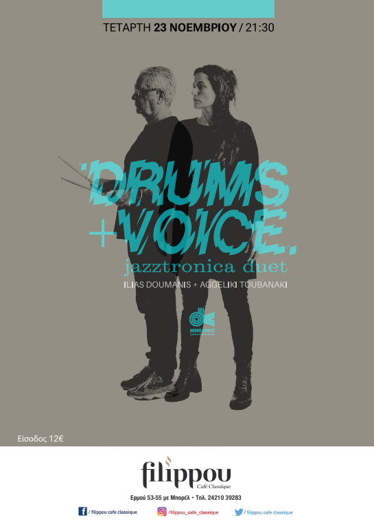 Την Τετάρτη 23 Νοεμβρίου στις 9:30 το βράδυ το Filippou Café Classique θα φιλοξενήσει το Jazztronica duet με τον Ηλία Δουμάνη και την Αγγελική Τουμπανάκη σε ένα μοναδικό live drums and voice .