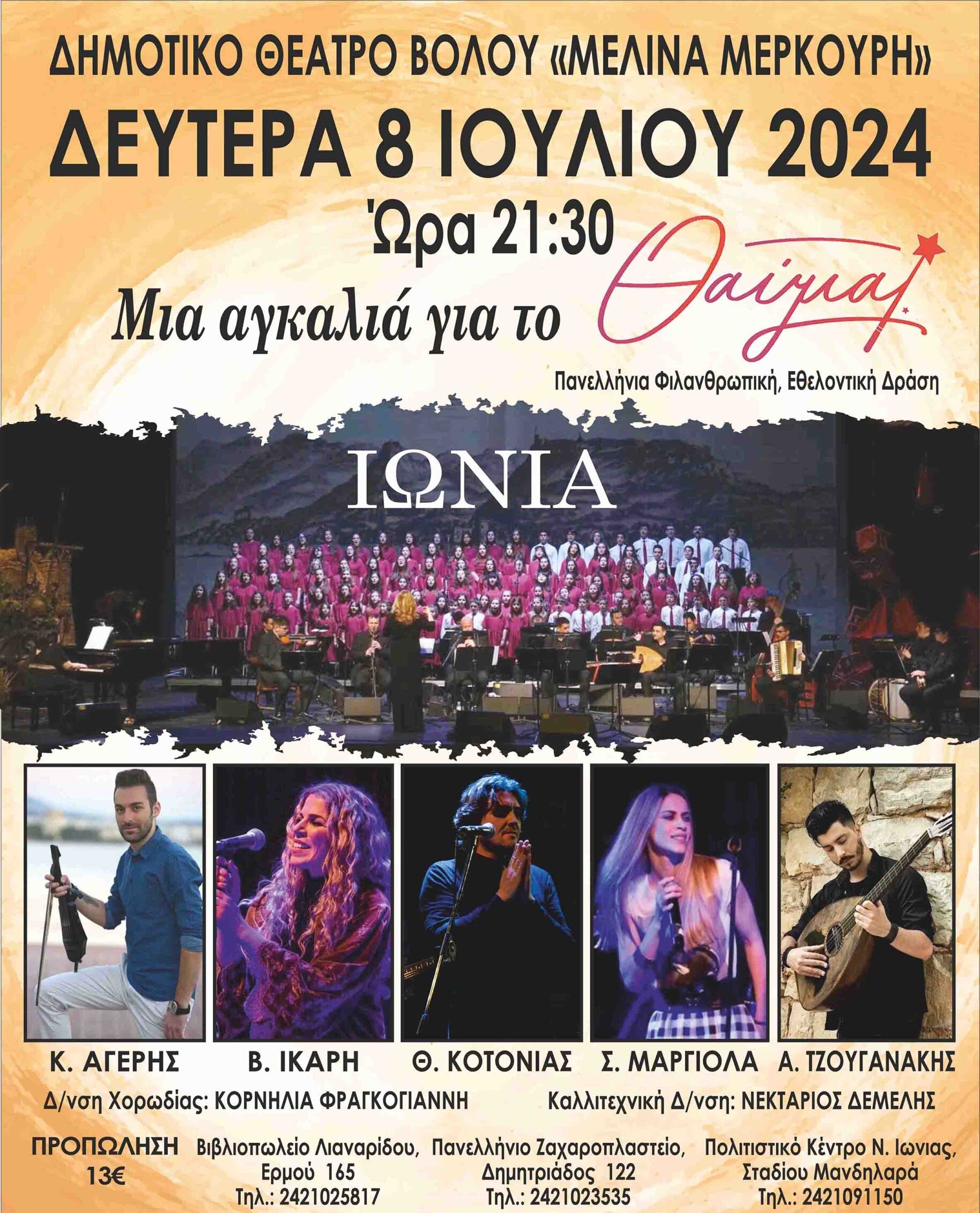 Μια αγκαλιά για το «Θαύμα» άνοιξε ώστε να υποδεχθεί την Ορχήστρα και Χορωδία «Ιωνία», αλλά και τους πέντε σημαντικούς καλλιτέχνες που ενώνουν τις φωνές τους σήμερα στις 9.30 το βράδυ στο θερινό Δημοτικό Θέατρο Βόλου Μελίνα Μερκούρη, για την ενίσχυση της πανελλήνιας φιλανθρωπικής δράσης, με πολλά μηνύματα για τη σημαντικότητα της προσφοράς στον συνάνθρωπο.