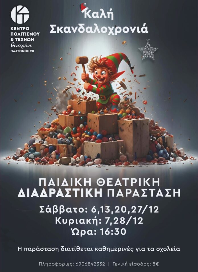 Το Κέντρο Πολιτισμού και Τεχνών Θεατρίνη ετοιμάζει και για φέτος παιδική χριστουγεννιάτικη διαδραστική παράσταση. Η νέα παιδική κωμωδία ονομάζεται «Καλή Σκανδαλοχρονιά!» και περιέχει πολλή διάδραση, χορογραφίες και τραγούδι.