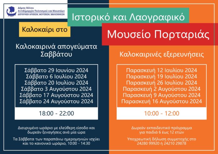 Οργανωμένες περιηγήσεις για ενήλικες για να περάσετε δροσερά και δημιουργικά το καλοκαιρινό σας απόγευμα ανακαλύπτοντας την ιδιαίτερη ιστορία της Πορταριάς, μέσα από τα εκθέματα του Ιστορικού και Λαογραφικού Μουσείου Πορταριάς, με διευρυμένο ωράριο, ελεύθερη είσοδο και δωρεάν ξεναγήσεις σε ομάδες επισκεπτών ανά μία ώρα, από τις 6 μ.μ. μέχρι και τις 10 μ.μ.