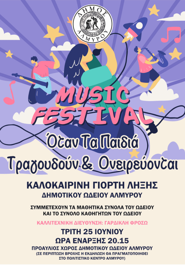 Καλοκαιρινή γιορτή λήξης του Δημοτικού Ωδείου Αλμυρού, θα πραγματοποιηθεί την Τρίτη 25 Ιουνίου 2024 στις 20.15, με τίτλο όταν τα παιδιά τραγουδούν και ονειρεύονται. Η εκδήλωση θα γίνει στον προαύλιο χώρο του Δημοτικού Ωδείου και θα συμμετάσχουν τα μαθητικά σύνολα του Ωδείου, σε ένα μουσικό φεστιβάλ, την καλλιτεχνική διεύθυνση του οποίου θα έχει η Φρόσω Γαρδικλή.