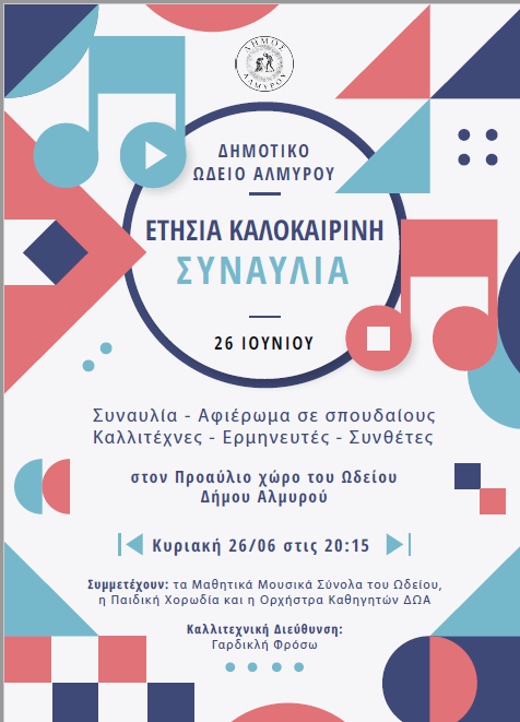 Το Δημοτικό Ωδείο Αλμυρού διοργανώνει ετήσια καλοκαιρινή συναυλία στις 26 Ιουνίου στις 20.15 μ.μ., ένα αφιέρωμα σε σπουδαίους καλλιτέχνες, ερμηνευτές και συνθέτες στον προαύλιο χώρο του Ωδείου. Στην εκδήλωση θα συμμετέχουν τα Μαθητικά Σύνολα του Ωδείου, η Παιδική Χορωδία και η Ορχήστρα Καθηγητών ΔΩΑ. Την καλλιτεχνική διεύθυνση έχει η Φρόσω Γαρδικλή.