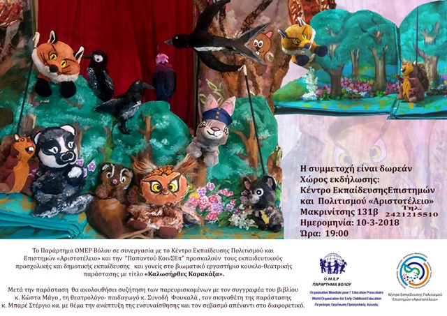 Το Παράρτημα ΟΜΕΡ Βόλου σε συνεργασία με το Κέντρο Εκπαίδευσης Πολιτισμού και Επιστημών «Αριστοτέλειο» προσκαλούν τους εκπαιδευτικούς προσχολικής και δημοτικής εκπαίδευσης στην κουκλο-θεατρική παράσταση της κοινωνικής συνεταιριστικής επιχείρησης συλλογικής και κοινωνικής ωφέλειας παραστατικών τεχνών “Παπαντού ΚοινΣΕπ” με τίτλο «Καλωσήρθες Καρακάξα». Η παράσταση είναι βασισμένη στο ομώνυμο παραμύθι του Κώστα Μάγου (εκδ. Καλειδοσκόπιο) που στοχεύει στην ανάπτυξη της ενσυναίσθησης του σεβασμού απέναντι στο διαφορετικό.