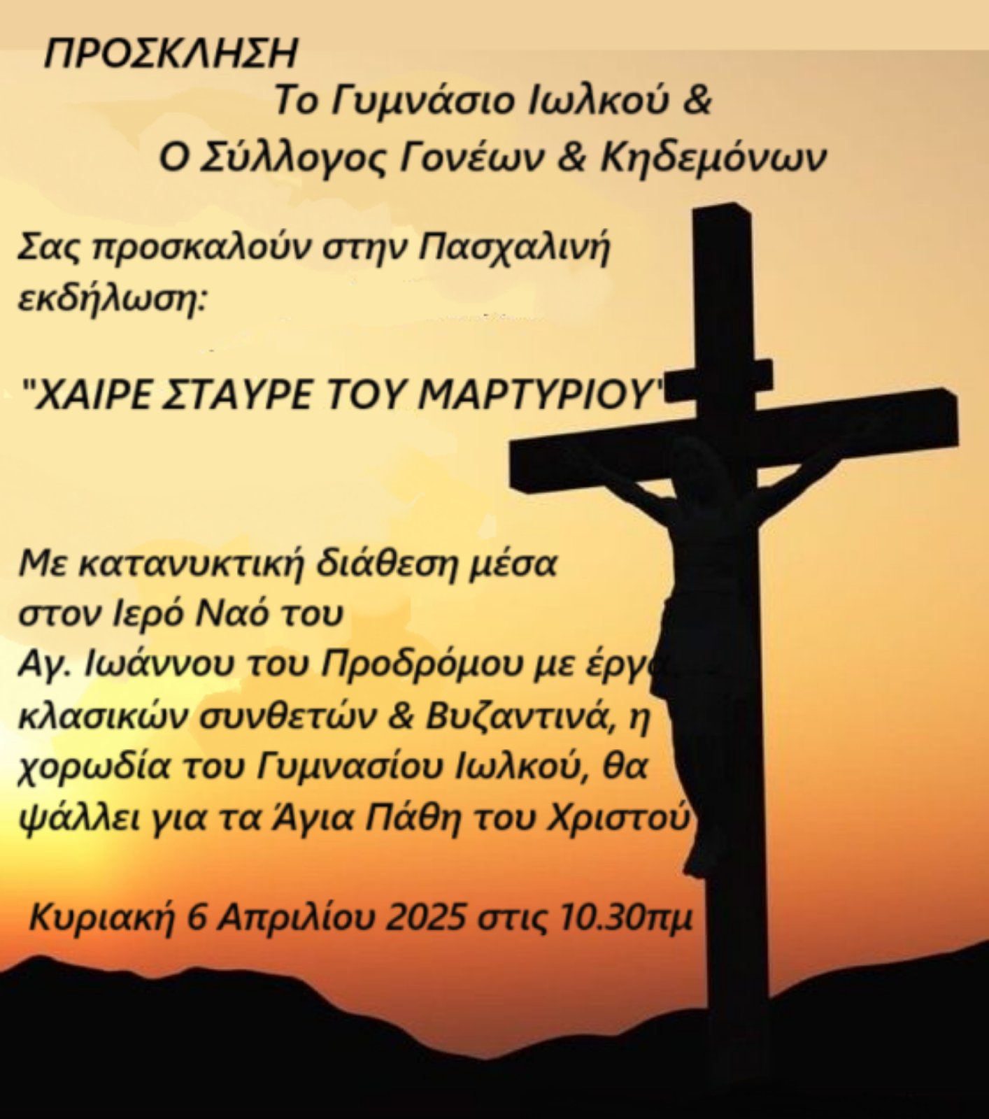 Την Κυριακή 6 Απριλίου, στις 10:30 π.μ στον Ιερό Ναό Αγίου Ιωάννη Προδρόμου Ανακασιάς, οι μαθητές της χορωδίας του Γυμνασίου Ιωλκού, υπό τις οδηγίες της καθηγήτρια τους, υψίφωνου, κ.Κατερίνας Αποστολοπούλου και της πιανίστριας κ.Εύης Κανελλοπούλου, θα ψάλλουν για τα Άγια Πάθη του Χριστού τόσο με έργα κλασσικών συνθετών όσο και Βυζαντινά.