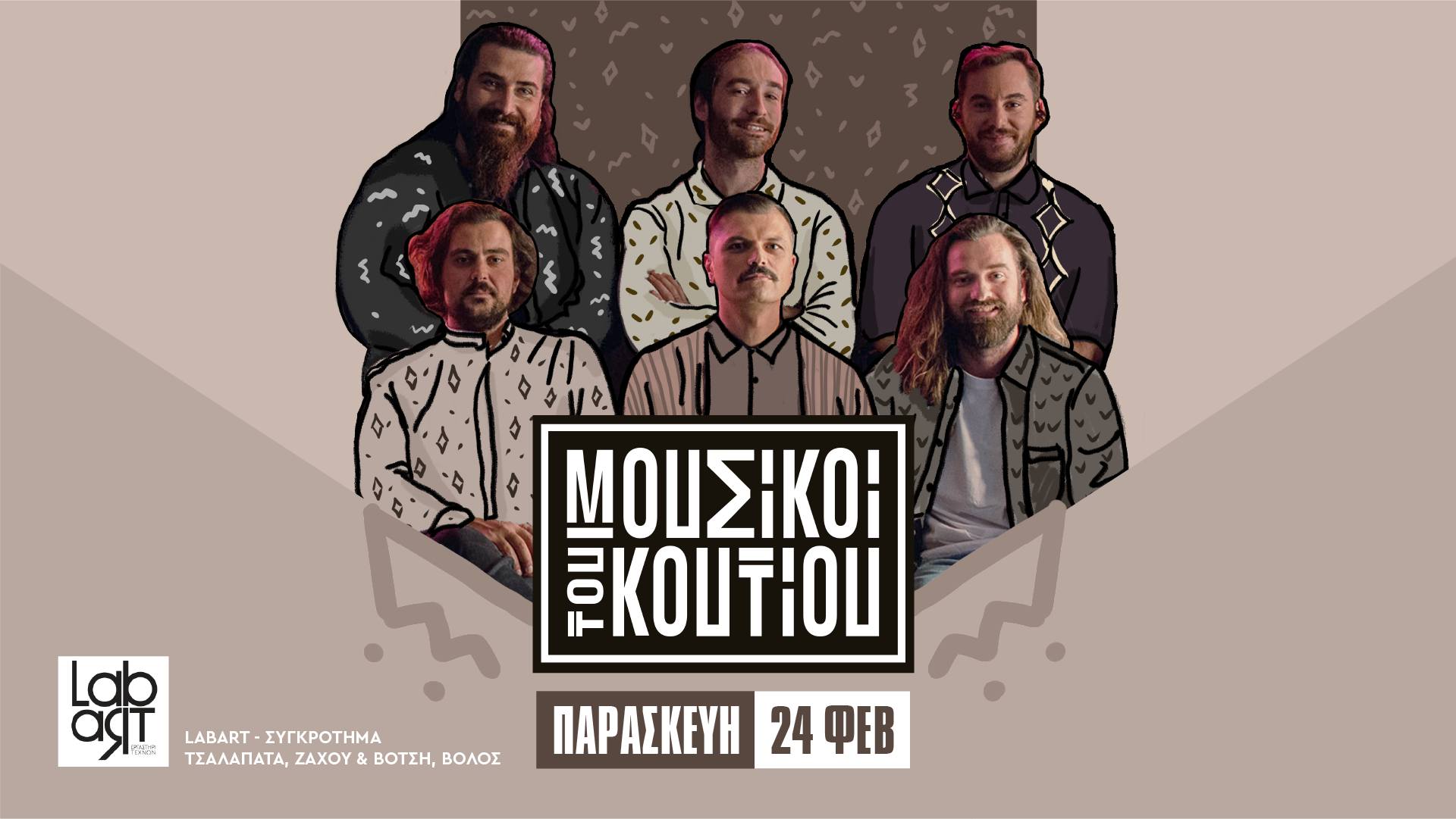 Οι Μουσικοί του Κουτιού, που αγαπήσαμε τις Τετάρτες μέσα από τη συχνότητα της ΕΡΤ1, ο Γιάννης Δίσκος, ο Δημήτρης Καζάνης, ο Λάμπης Κουντουρόγιαννης, ο Θανάσης Τσακιράκης, ο Βύρωνας Τσουράπης και ο Στέλιος Φραγκούς βρέθηκαν μαζί ως μπάντα για πρώτη φορά το 2020 για τις πρόβες της εκπομπής “Μουσικό Κουτί”. Φέτος, παράλληλα με την τηλεοπτική τους επιστροφή για την 3η σεζόν της εκπομπής, ξεκινούν μια σειρά ζωντανών εμφανίσεων σε όλη την Ελλάδα κάνοντας την πιο “Αποκριάτικη” στάση, στον αγαπημένο Βόλο. Απόψε Παρασκευή 24 Φεβρουαρίου, η μπάντα των 1.400 διασκευών υπόσχεται μια ξεχωριστή μουσική εμπειρία. Ανατολίτικη μουσική με αυθεντική ροκ, hip hop με ρεμπέτικα, indie και pop, λαϊκά και έντεχνα, συνδυάζονται μέσα από αγαπημένες διασκευές και απρόβλεπτα μουσικά “παντρέματα”.