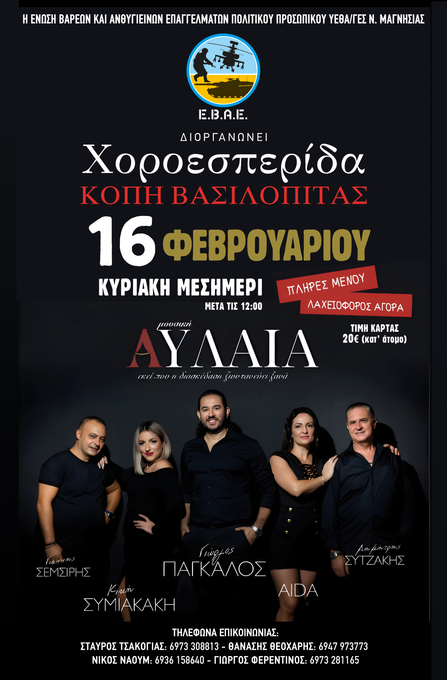 Η Ένωση Βαρέων και Ανθυγιεινών Επαγγελμάτων του Πολιτικού Προσωπικού των Σχηματισμών του ΥΕΘΑ/ΓΕΣ Νομού Μαγνησίας διοργανώνει εκδήλωση για την κοπή της βασιλόπιτας και Χοροεσπερίδα την Κυριακή 16 Φεβρουαρίου μετά τις 12:00 το μεσημέρι στην “Μουσική ΑΥΛΑΙΑ” στα Παλαιά Βόλου (Αλμυρού 9 & Λαχανά) με ζωντανή μουσική από τον Γιώργο Πάγκαλο και την ορχήστρα του, με πλήρες μενού, απεριόριστα ποτά και πλούσια λαχειοφόρο.
