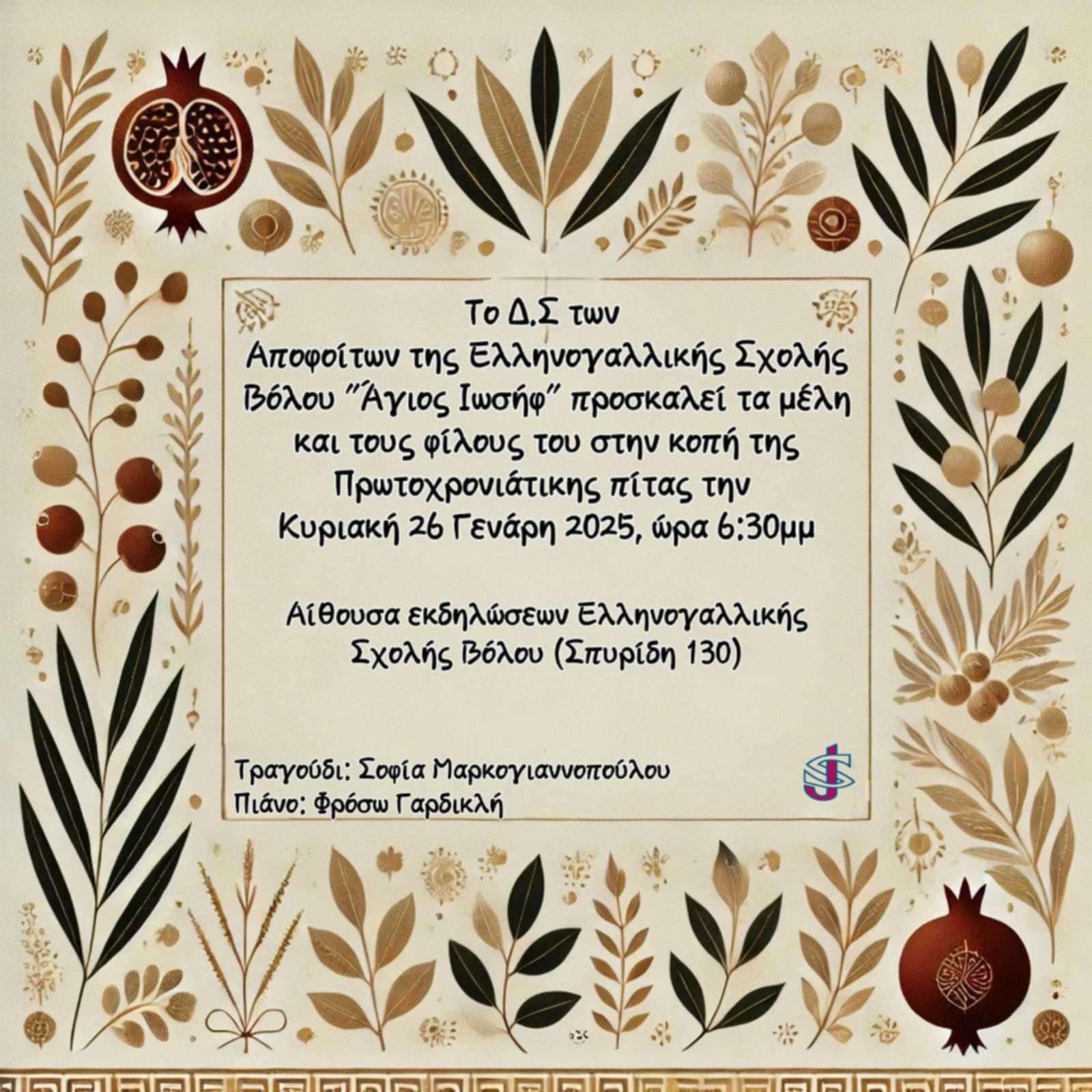 Εκδήλωση για την κοπή της πρωτοχρονιάτικης πίτας του πραγματοποιεί ο Σύλλογος Αποφοίτων της Ελληνογαλλικής Σχολής Βόλου «Άγιος Ιωσήφ» την Κυριακή 26 Ιανουαρίου στις 6.30 το απόγευμα στην αίθουσα εκδηλώσεων της Ελληνογαλλικής Σχολής Βόλου, στην οδό Σπυρίδη 130.