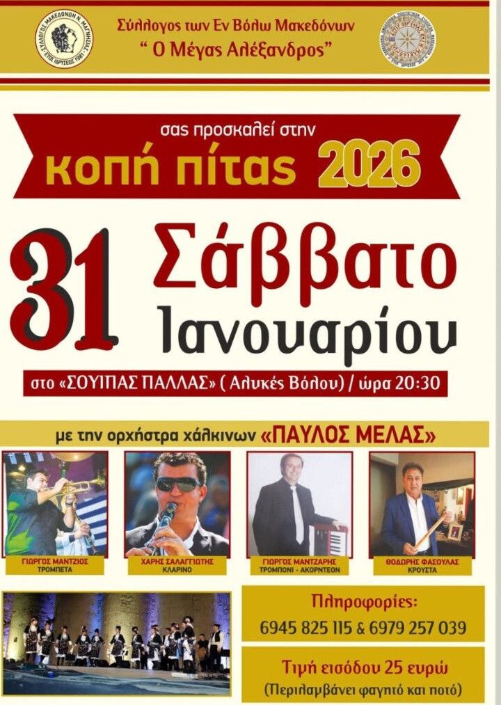 O Σύλλογος Μακεδόνων Βόλου «Ο Μέγας Αλέξανδρος» διοργανώνει το Σάββατο 31 Ιανουαρίου και ώρα 20:30 τον ετήσιο χορό και την κοπή πίτας του. Η εκδήλωση θα πραγματοποιηθεί στο ΣΟΥΪΠΑΣ ΠΑΛΛΑΣ (Αλυκές Βόλου ) με ζωντανή μουσική από την ορχήστρα χάλκινων «Παύλος Μελάς».