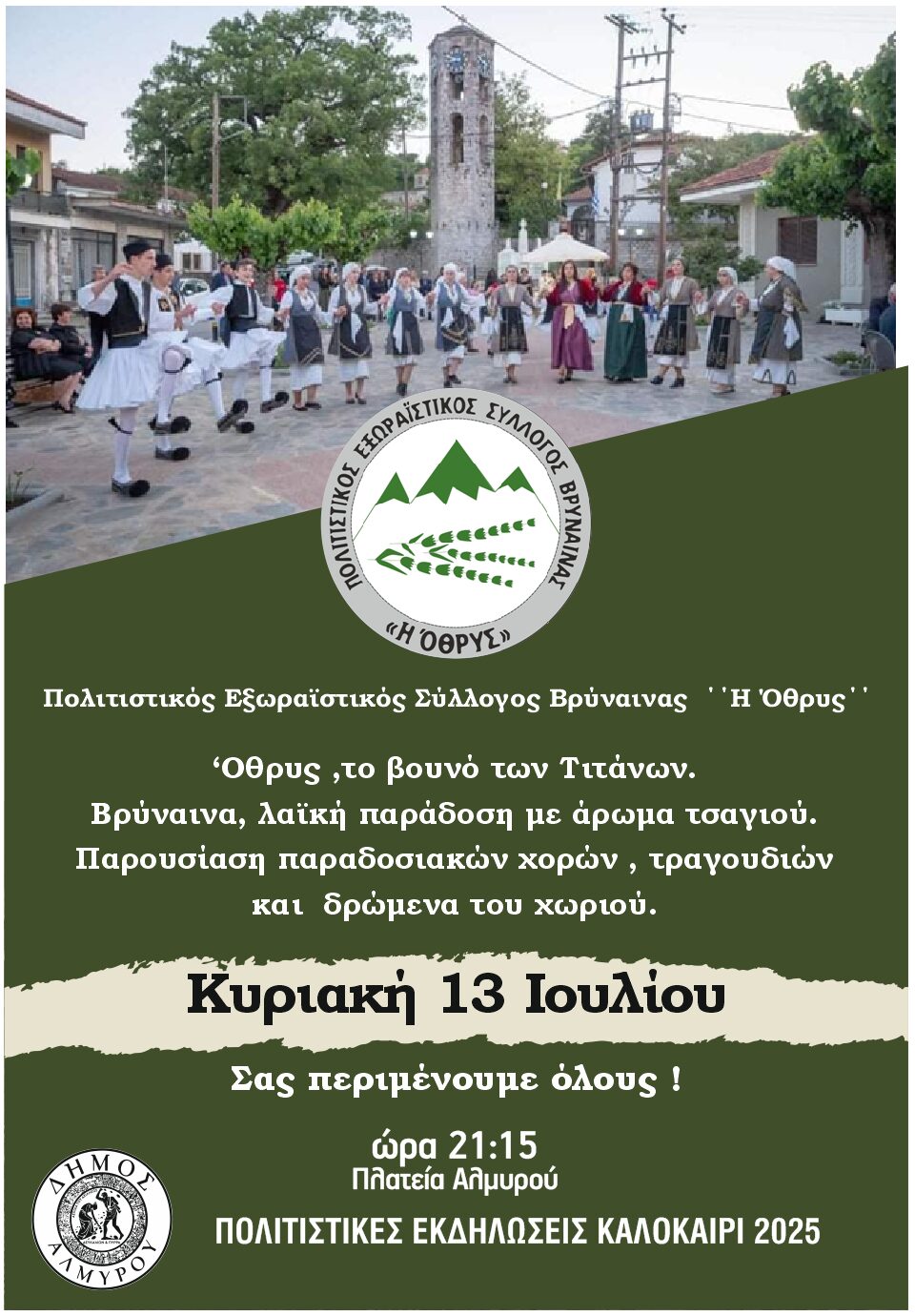 Ο Πολιτιστικός – Εξωραϊστικός Σύλλογος Βρύναινας “Η Όθρυς” διοργανώνει την Κυριακή 13 Ιουλίου στις 21:15 στην Κεντρική Πλατεία Αλμυρού, μία βραδιά γνήσιας λαϊκής παράδοσης με άρωμα.. τσαγιού! Θα παρουσιαστούν παραδοσιακοί χοροί, τραγούδια και δρώμενα του όμορφου χωριού της Όθρυος.