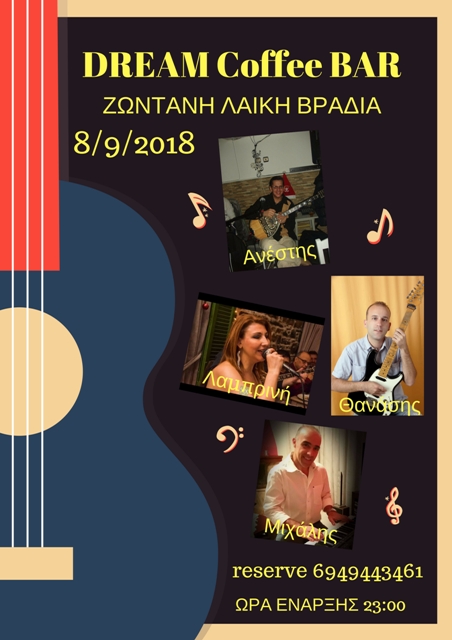 Μια υπέροχη ζωντανή έντεχνη – λαϊκή βραδιά υπόσχεται το Dream Coffee Bar στα Κανάλια το Σάββατο 8 Σεπτεμβρίου στις 23:00.