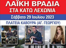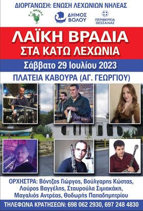 Η Ένωση Λεχωνίων «ΝΗΛΕΑΣ» και το τμήμα ακαδημιών διοργανώνουν λαϊκή βραδιά με ζωντανή μουσική το Σάββατο 29 Ιουλίου στην πλατεία του Αγίου Γεωργίου στα Κάτω Λεχώνια.