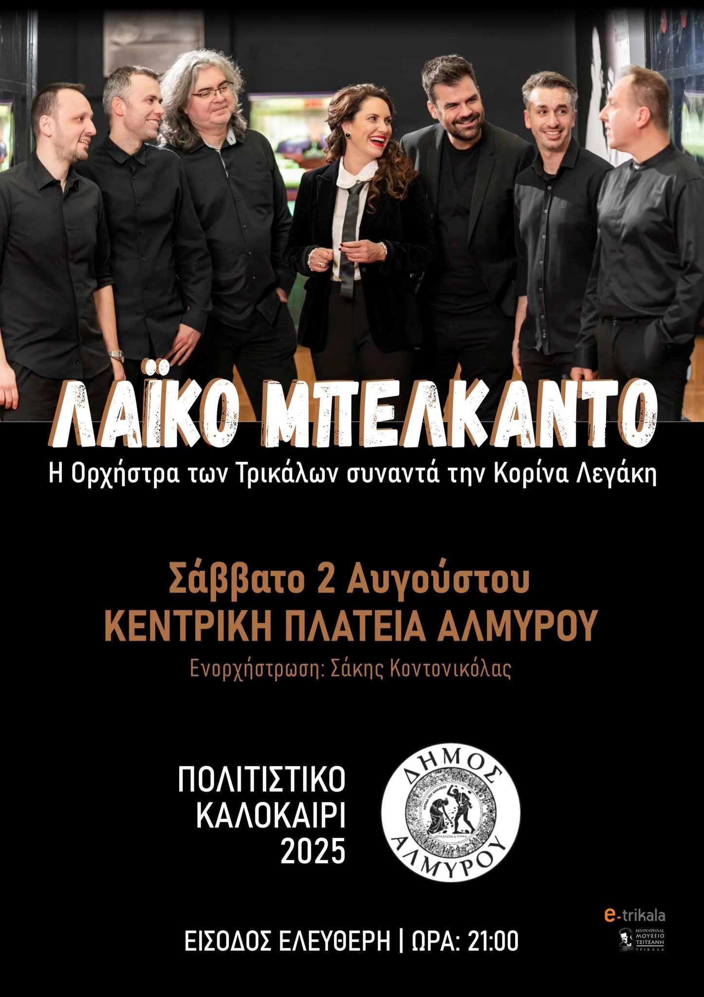 Η Κορίνα Λεγάκη συναντά την Ορχήστρα των Τρικάλων για ένα Λαϊκό Μπελκάντο το Σάββατο 2 Αυγούστου στην Κεντρική Πλατεία Αλμυρού στις 21:00. Η είσοδος είναι ελεύθερη.