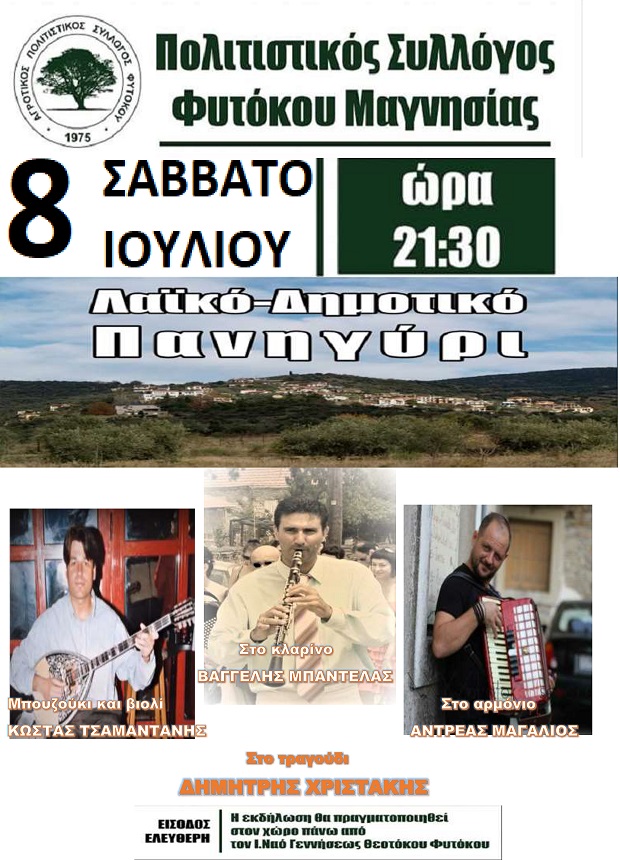 Ο Αγροτικός – Πολιτιστικός – Αθλητικός σύλλογο Φυτόκου καλεί όλους να διασκεδάσουν παρέα, αύριο Σάββατο 8 Ιουλίου, στο λαϊκό πανηγύρι που διοργανώνει με λαϊκοδημοτική ορχήστρα στον χώρο εκδηλώσεων του οικισμού, πάνω από τον Ιερό Ναό της Παναγίας. Στον χώρο θα λειτουργεί καντίνα.