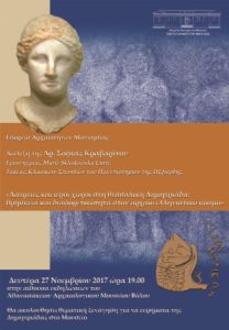 Την Δευτέρα 27 Νοεμβρίου 2017 ώρα 19.00 στην αίθουσα εκδηλώσεων του Αθανασάκειου Αρχαιολογικού Μουσείου Βόλου θα πραγματοποιηθεί διάλεξη της Δρος Σοφίας Κραβαρίτου με θέμα: «Λατρείες και ιεροί χώροι στη θεσσαλική Δημητριάδα: θρησκεία και διαφορετικότητα στον αρχαίο ελληνιστικό κόσμο».
