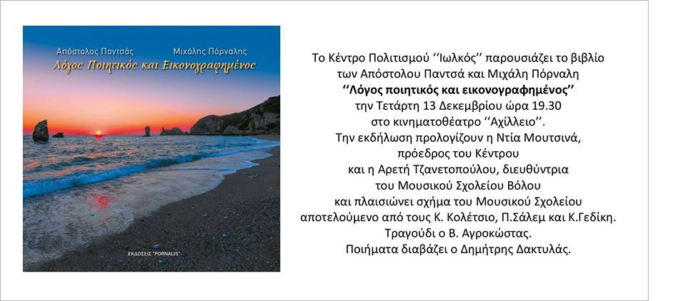Η παρουσίαση της συλλογής ποιημάτων του κ. Απόστολου Παντσά (εικονογραφημένη από τον Μιχ. Πόρναλη), και με τον τίτλο «Λόγος ποιητικός και εικονογραφημένος», προγραμματίστηκε και θα γίνει την Τετάρτη 13 Δεκεμβρίου και ώρα 19.30 στο κινηματοθέατρο «Αχίλλειον».