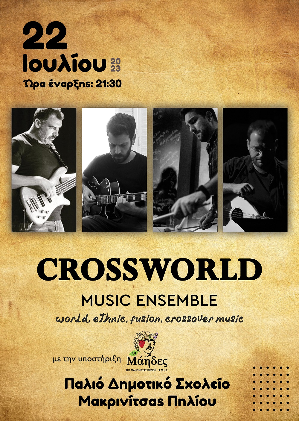 Θα επακολουθήσει μουσική βραδιά στην αυλή του σχολείου με ζωντανή μουσική, από το Crossworld Music Ensemble, ένα νεοσύστατο μουσικό σύνολο που αποτελείται από τέσσερις μουσικούς με κοινό σημείο επικοινωνίας το ενδιαφέρον για εξερεύνηση παραδοσιακών μουσικών ιδιωμάτων ανά την υφήλιο.